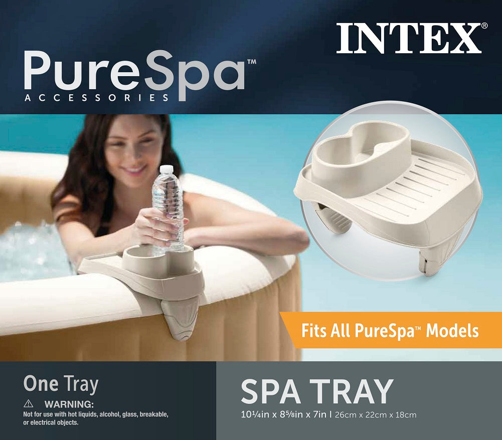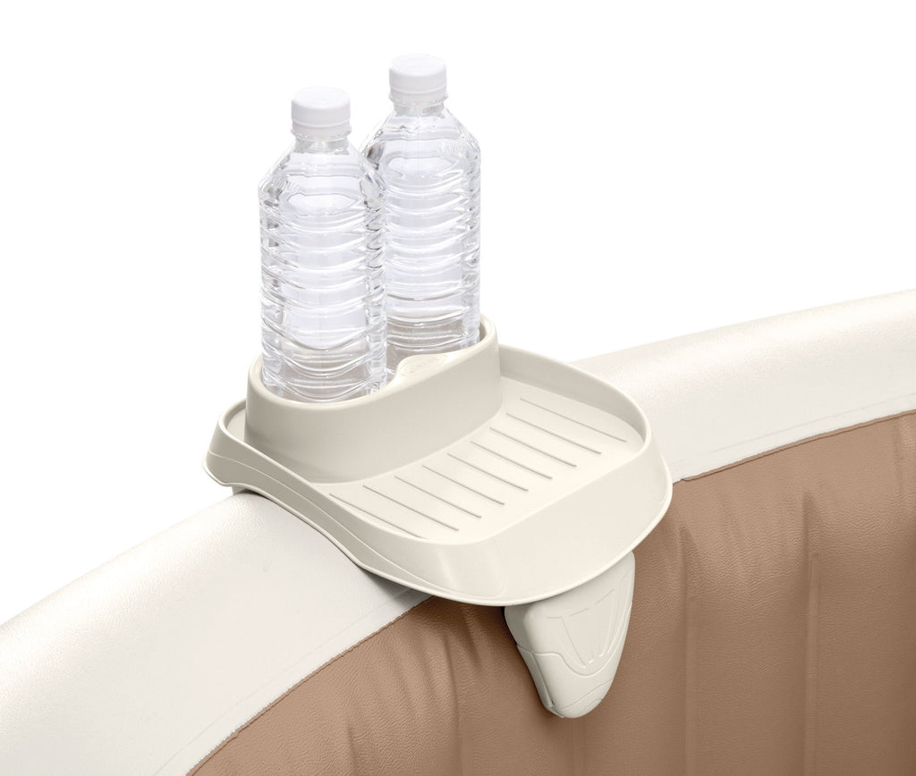 The Intex PureSpa Inflatable Hot Tub Cup Holder Holds 2 Standard Beverages is designed to securely attach to the spa wall. Perfect for your Intex PureSpa and other Inflatable spas. This spa tray keeps beverages and snacks close by while you relax. Removable for convenience. Holds 2 standard size beverage containers. Dimensions: 10.25in L X 8.63in W X 7in H