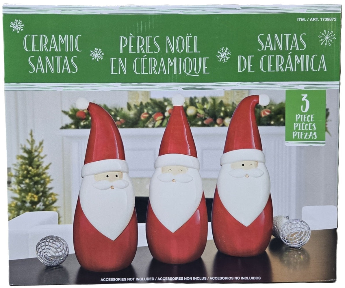 Festive and fun, this set of 3 Santas is sure to bring joy to your holiday season. Each ceramic Santa has been hand-painted in a bright holiday red, and has a unique, expressive face. The set will make an impactful statement on any mantel or tabletop. Features: Set of 3. Hand-painted. For Indoor decorative use only. Specifications: Each Snowman Dimensions: 6.3"L X 6.14"W X 15.83"H
