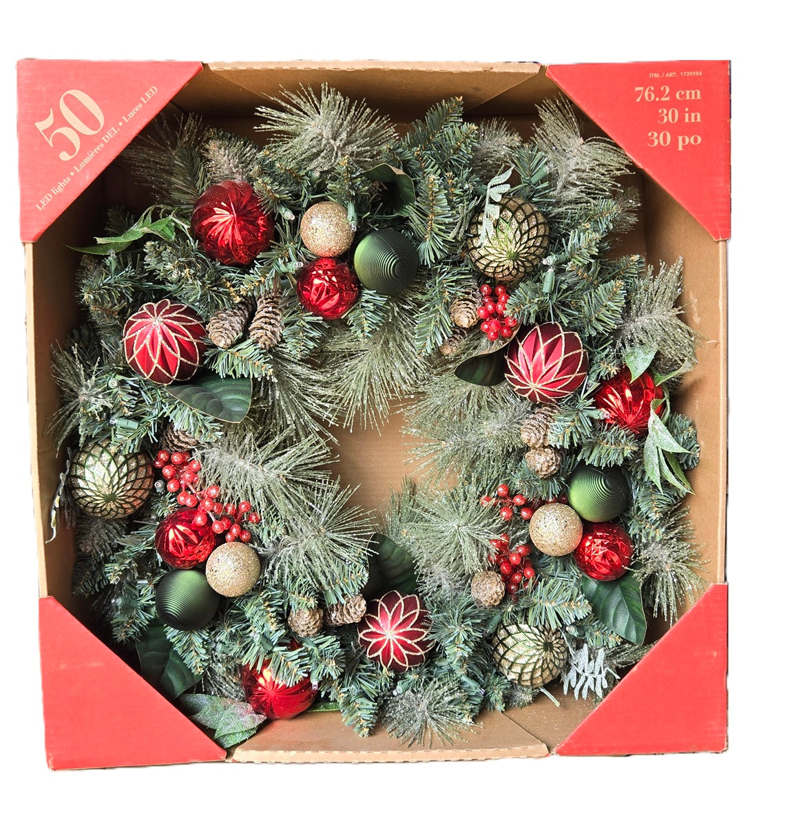 Create the perfect holiday atmosphere this Christmas with this holiday four-piece set. This set of four comes with two 3.5-foot pre-lit potted tree, one nine-foot long pre-lit garland, and a 24-inch pre-lit wreath. Each decoration piece is already pre-decorated with pine cones and berries. It also comes pre-lit with outdoor clear incandescent lights. Place the set of four all over...