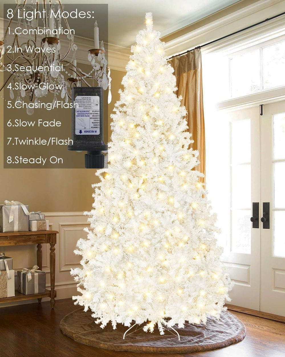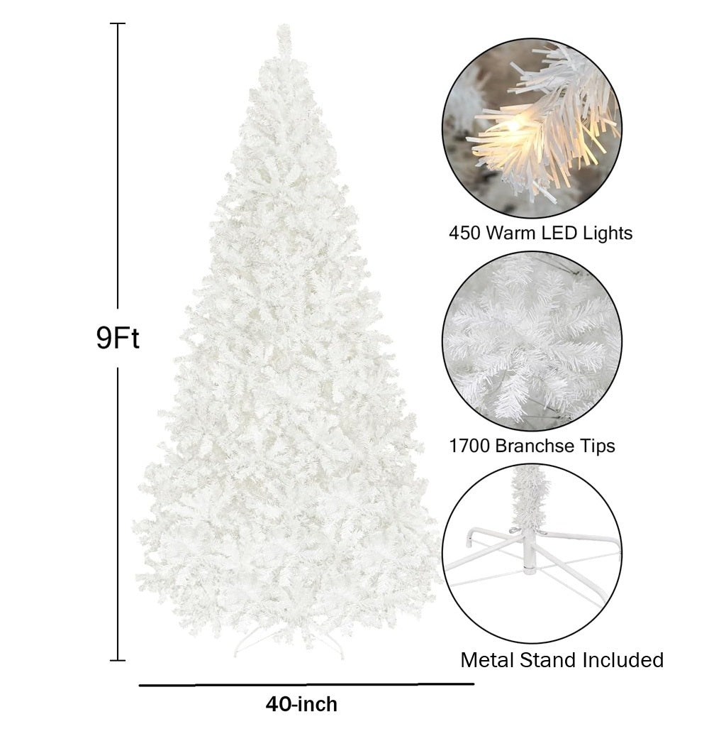 This 9-foot White Artificial Christmas tree stands at 9 feet tall with 1,700 branch tips and 450 LED lights, our white Christmas tree is well-made, perfectly sized, and nicely shaped. The base includes three screws to hold it in place and secure the bottom piece. The tree consists of three sections that fit perfectly into one another. The base is also weighted to ensure stability. The plentiful LED lights are nestled between the branches, emitting a warm glow. A refreshing departure from traditional green trees and saves you the hassle. You can place the white Christmas tree indoors for a warm, Christmas ambiance or move it to a covered outdoor to light up your Christmas night. An easy way to spruce up your decor for the holiday season. Easily adorn an entry table, fireplace mantle, or shelf with our tree, along with some miniatures, to create a lovely holiday display and a winter wonderland indoors.