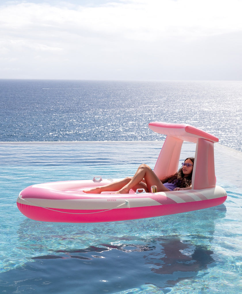 Make a statement at your next pool party with this eye-catching pink boat-style float, designed for ultimate comfort and fun. Whether you're lounging solo or floating with a friend, the spacious design offers plenty of room to stretch out and soak up the sun. The built-in bimini top provides refreshing shade on hot days, so you can stay cool while...