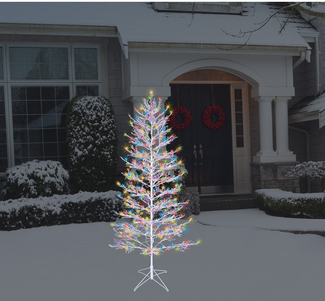 Decorate for the season with the elegant GE Winterberry Pre-Lit 7-FT White Branch Tree with Multicolor LED Microbright Lights with 600 8.8mm color changing lights. Use the control box to choose between warm white lights, multicolor lights, or a light show. Molded realistic looking white glittered berry branches, 486 branch tips, hinged construction, 42-inch tree diameter with metal tree stand...