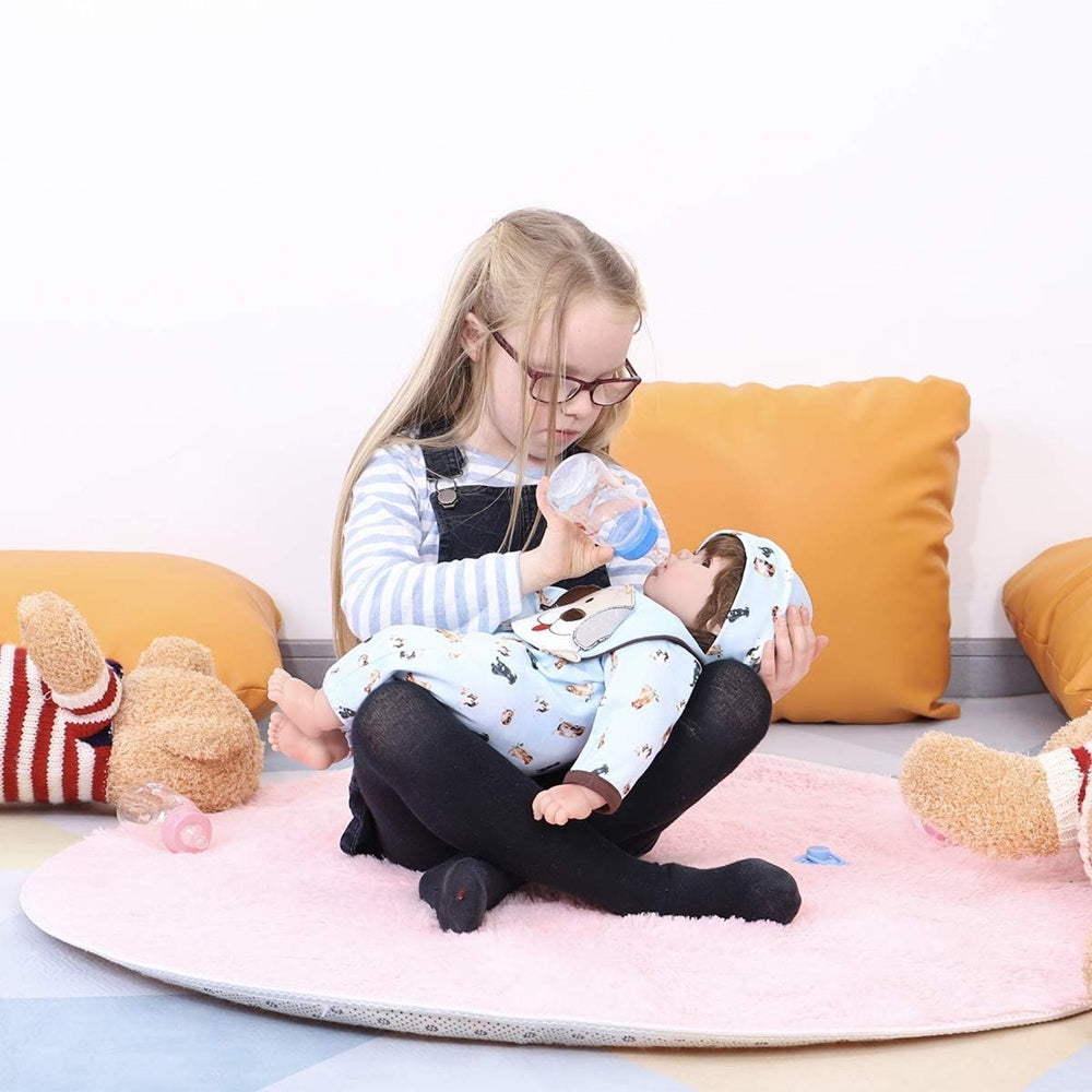 The ENADOLL 22-inch Reborn Lifelike Baby Doll Boy Realistic Silicone has big brown charming eyes, handcrafted fluffy artificial hair which is very realistic. It can be shaped, combed, washed even cut for a better style. Our gift set comes with clothes, a matching pacifier and a feeding-bottle. Head, arms, and legs are dedicated made of soft silicone vinyl materials (15% silicone and 85% vinyl). And the weighted cloth body feels soft like a real baby. The clothes are made of eco-friendly PP soft and polyester fiber 100% handcrafted. The baby doll is about 22 inches from head to toe, weighs about 2.6 lbs, which is lifelike designed for toddlers ages 3 and older. The doll is hand-crafted, and legs are naturally curved, please allow slight measurement deviation. Most kids like dolls, they will inspire kids' imaginations and encourage kids to take responsibility in their daily life which is good for kids' personality development.