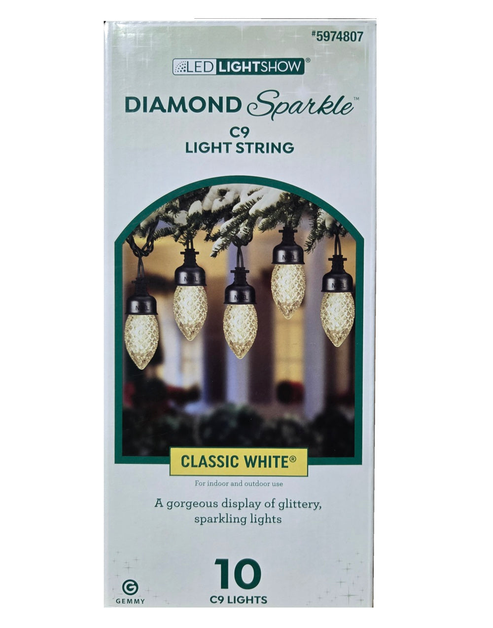 Put on a glittery display of sparkling lights this holiday season with a Diamond Sparkle light string. Each C9 bulb has a faceted cover that delivers a magnificent light effect. This set of 10 C9 bulbs includes classic white light and an astonishing 90 LED lights, with 9 per bulb. It's perfect for outdoor holiday decorating along rooflines, in trees or anywhere you enjoy Christmas lights. Includes bright, energy efficient LED lights. Ten C9 Lights. Color: Classic White. Connect up to 18 LightShow sets end to end. Indoor/Outdoor Use. Total Length 10.5-ft, lighted length 9-ft.