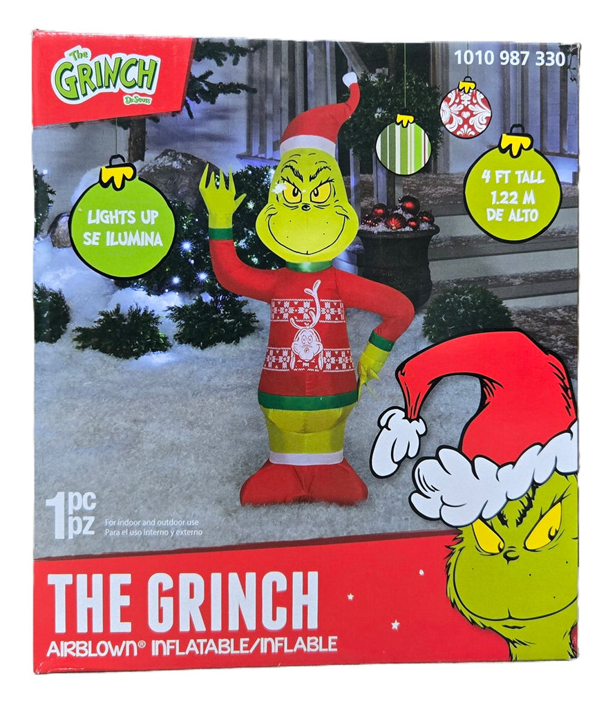 Create a fun, memorable holiday scene in your home or yard with this 4 ft. LED Grinch in Max Sweater Christmas Inflatable. The vibrant LED lights illuminates the Grinch with a festive glow, bringing the classic character to life. The self-inflating design with stakes and tethers included allows effortless setup. Activate the integrated LED lights by plugging the power cord...