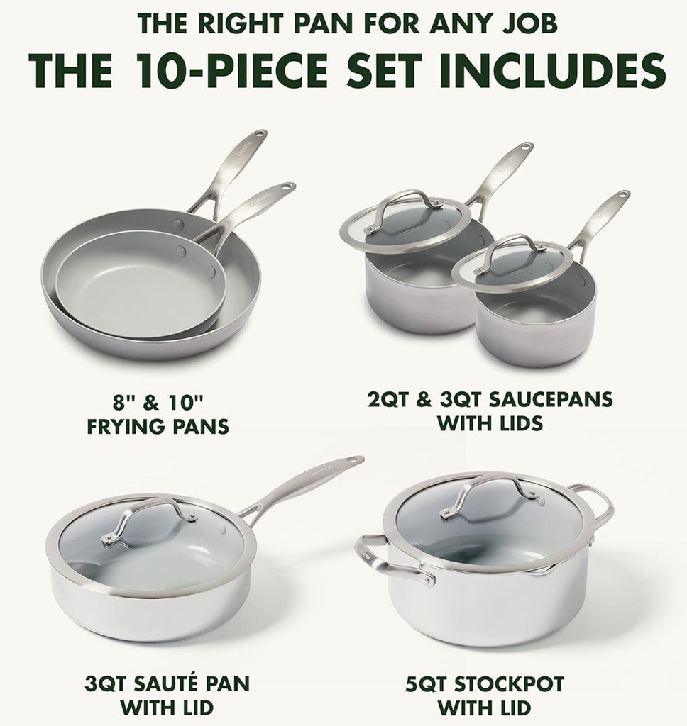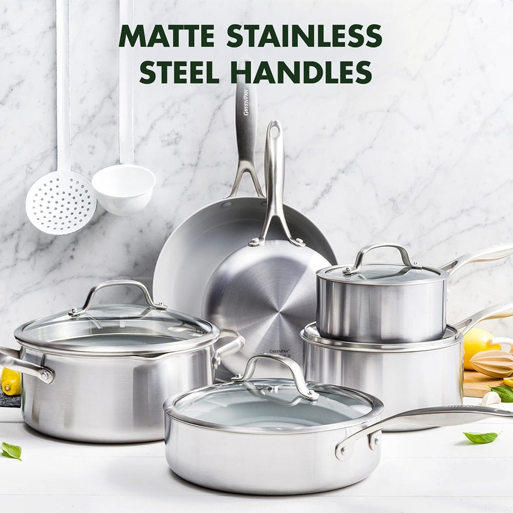 The GreenPan Venice Pro 10-Piece Cookware Set Stainless Steel Ceramic Non-Stick Dove Grey extra durable cookware with a timeless design, our Venice Pro Collection is perfect for everyday use. The multilayer stainless steel body is stylish, durable, and suitable for all cooking surfaces including induction. The striking exterior is finished with Evershine, which means this stainless steel will stay beautiful...