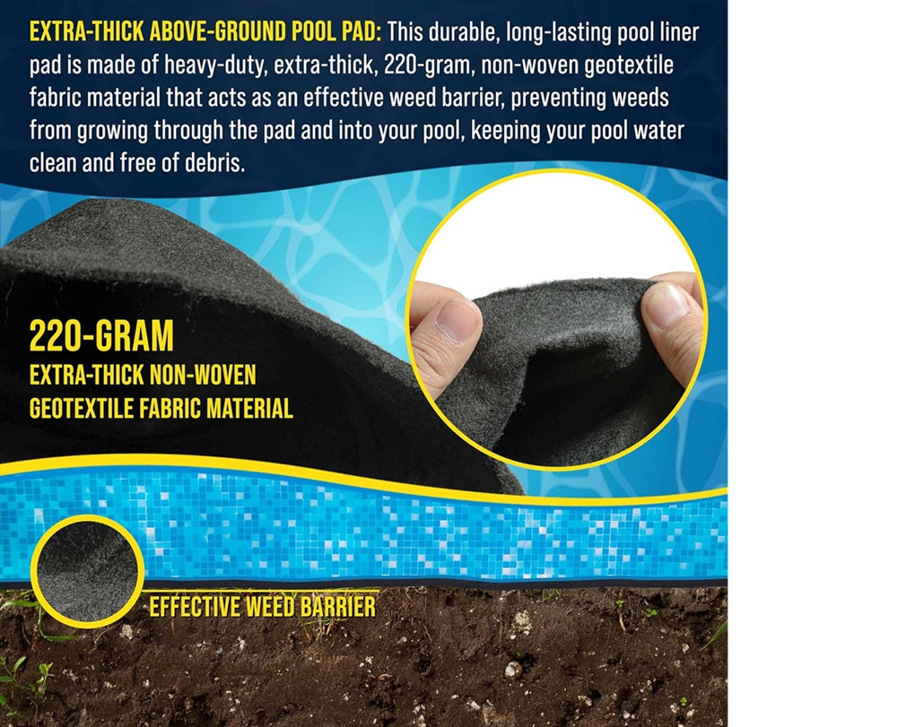 - Extra-Thick Above-Ground Pool Pad: This durable, long-lasting pool liner pad is made of heavy-duty, extra-thick, 220-gram, non-woven geotextile fabric material that acts as an effective weed barrier, preventing weeds from growing through the pad and into your pool, keeping your pool water clean and free of debris.