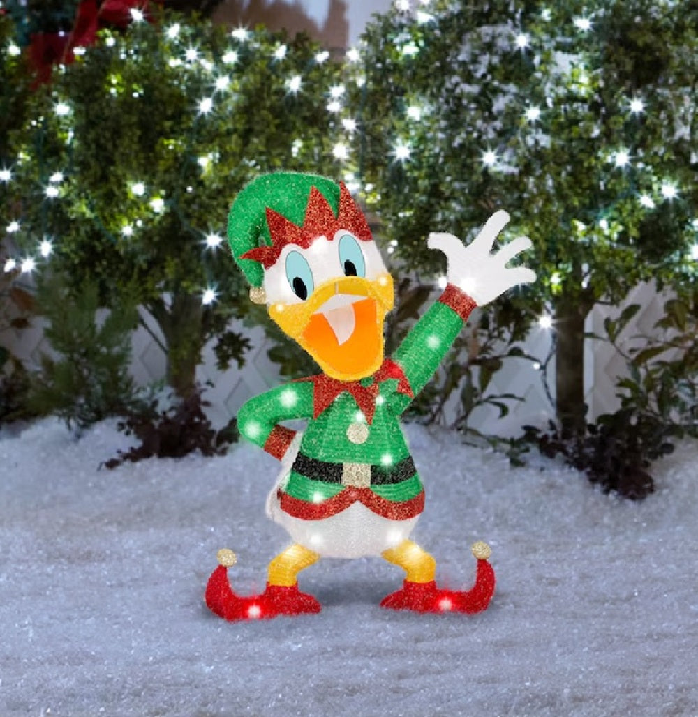 Create an eye-catching focal point with Donald Duck Christmas yard decor! The lighted Donald Duck character makes a delightful addition to your indoor or outdoor Christmas decorations. Featuring a cheery Donald Duck in an elf outfit, this 3D Disney yard sculpture is made with soft, fuzzy material that creates a tinsel effect. Outfitted with 30 pre-attached lights, this colorful Donald...