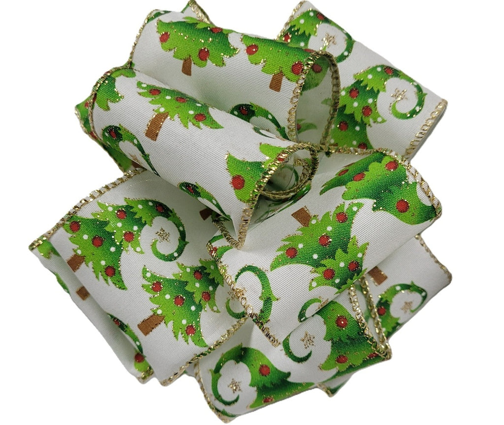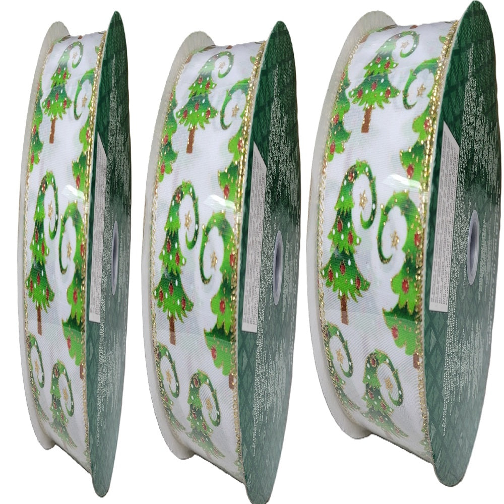 The Wire-Edged White Ribbon with Christmas Trees Glitter Accents is a beautiful spool of ribbon to create beautiful bows for your Christmas gifts or to adorn your Christmas tree, mantle or stairway. This premium stylish holiday ribbon has been carefully selected. This white ribbon features green Christmas trees with red balls and gold accents is high-quality, finish-stitched gold edges. Made...
