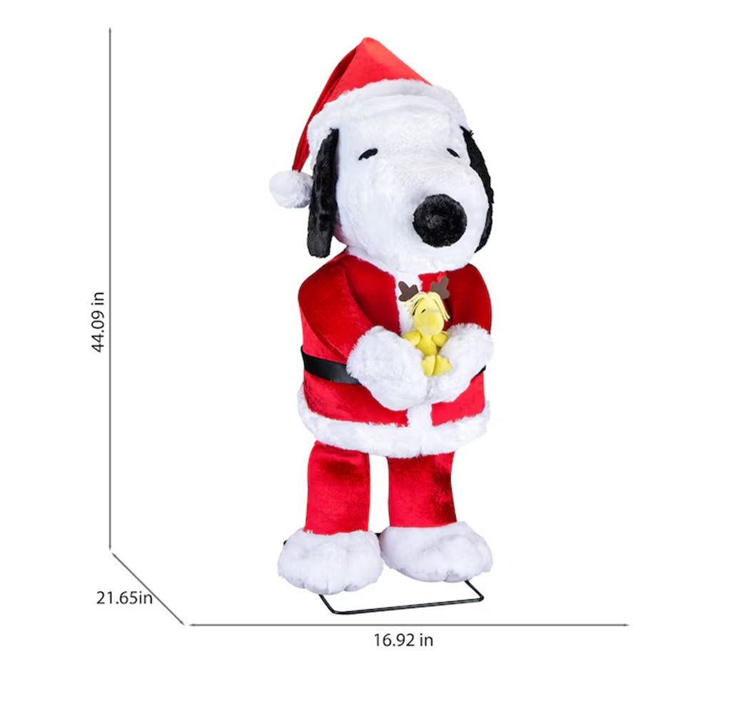 Delight Peanuts fans of all ages with an animated Snoopy holding Woodstock! Dressed in a luxurious plush Santa suit, our 3.5-ft Snoopy dances to the tune of "Linus and Lucy". This amazing Snoopy makes an impressive addition to your indoor Christmas decorations. Works via push-button or sound activation. Includes instructions, a stand for stability and everything needed for easy setup....