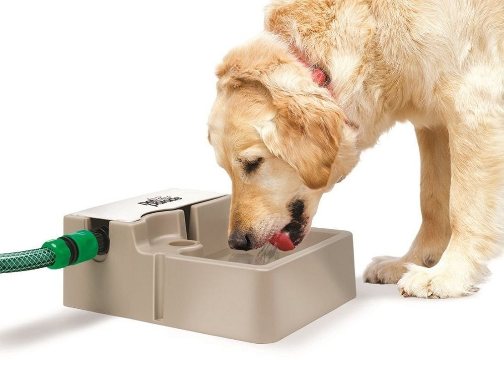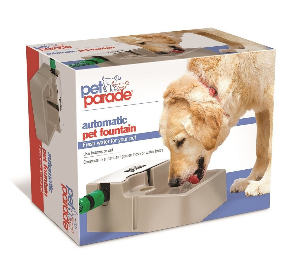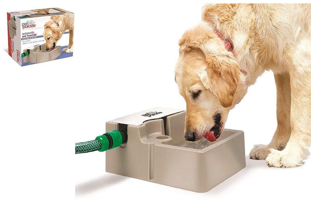 Automatic Pet Fountain Fresh water for your pet Connects to a garden hose or a water bottle (for indoor use) Automatic pressure shut off to avoid spillover Ideal for dogs, cats, birds, etc. 2 liter bowl capacity. Product Details: Automatic Pet Fountain. Fresh water for your pet. Can be placed on the ground or wall mounted (hardware NOT included). Continuous...