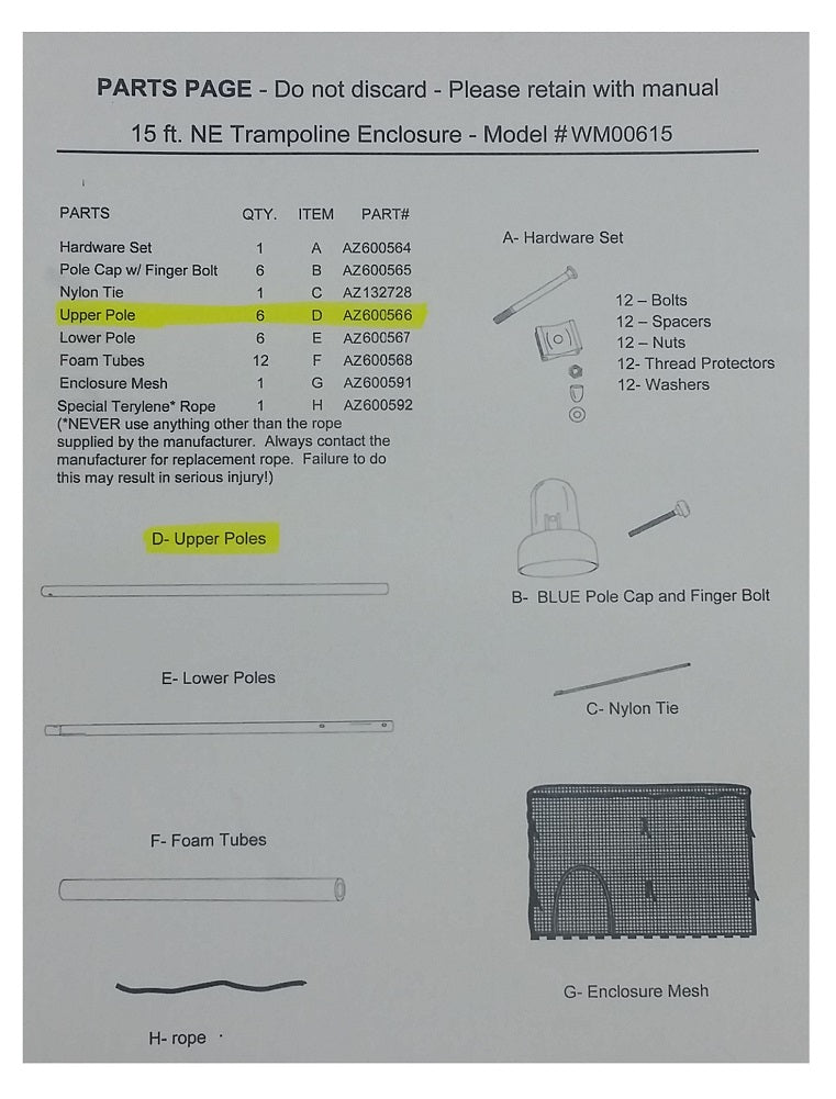 • Part Information: Part: Upper Pole. Item: D. Part # AZ600566