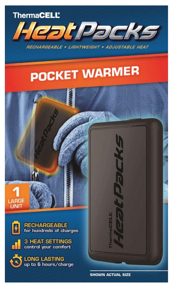 The ThermaCELL HeatPacks Rechargeable Pocket Warmers, Large, provides regulated warmth that lasts up to 6 hours per charge. Simply select one of three temperature settings and place the thin, lightweight pack inside your pocket to provide your hands and body with consistent warmth. Lightweight and rechargeable, this Heat Pack can be charged hundreds of times to give you convenient warmth...