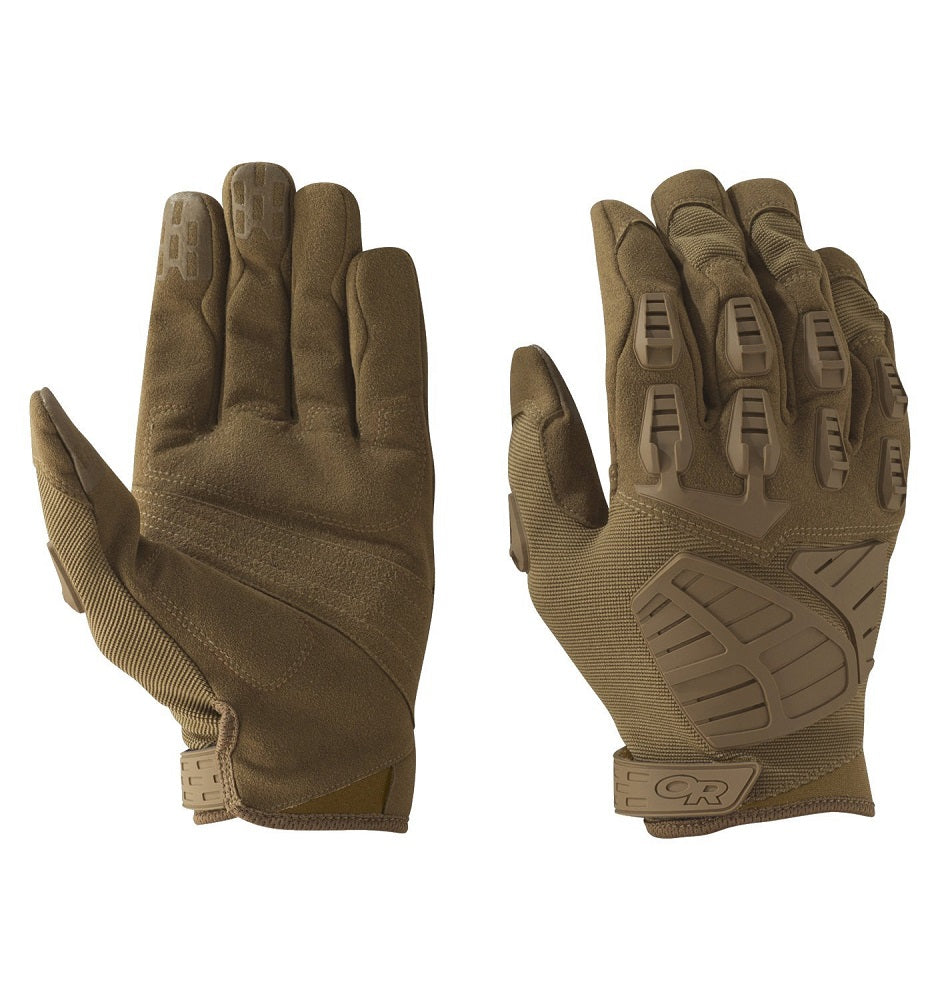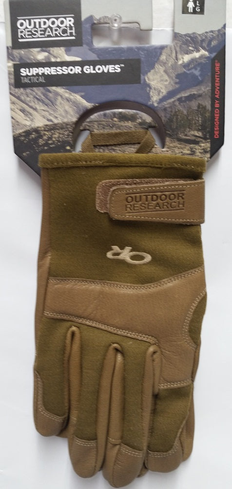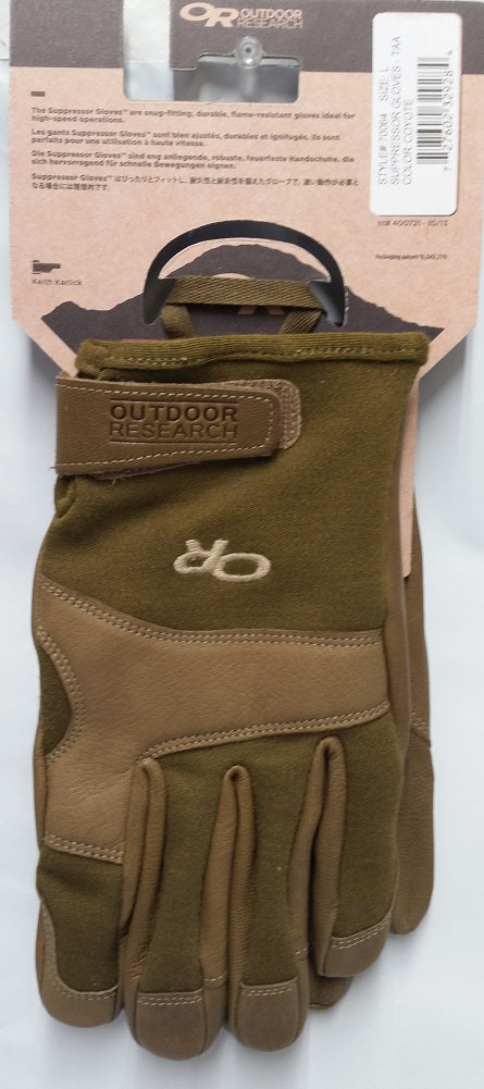 Durable, snug-fitting protection that's ideal for weapons and equipment control, Outdoor Research Suppressor TAA Gloves Coyote, Large, gloves are flame- and flash-resistant resistant. The pre-curved construction with easy articulation requires no break-in period and a comfortable touch-fasten wrist strap secures the fit. Product Details: Interlock knit design constructed from flame- and flash-resistant Nomex®-blend technology. TAA-compliant design and construction. Durable goatskin...