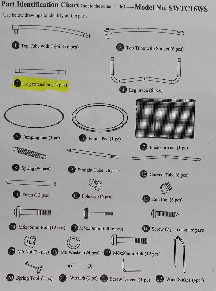 *** NO RETAIL BOX Replacing a whole trampoline can be expensive. The Skywalker Trampoline 16' Round Replacement Part, Leg Extension measures 22.5" Length x 1.5" Width. Product Details: Skywalker Trampoline. 16' Round. Part List Description: Leg Extension. Key # 3. Sold in quantities of ONE. (Twelve pieces are needed to complete the trampoline.) Fits Models: SWTC16WS.