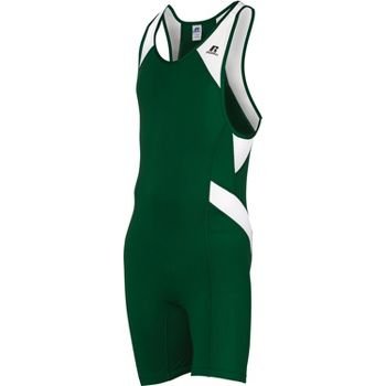 The Russell Athletic Men's Wrestling Sprinter Singlet Suit LARGE Dark Green/White is perfect for the beginning wrestler to experienced. The material is comfortable with durable nylon and spandex, large arm holes for maximum range of motion and 3/4" gripper elastic around each leg opening to minimize riding up. The singlet is royal with white on the shoulders and hips. The...