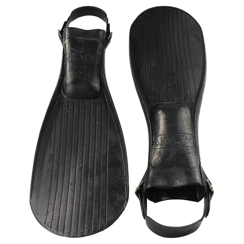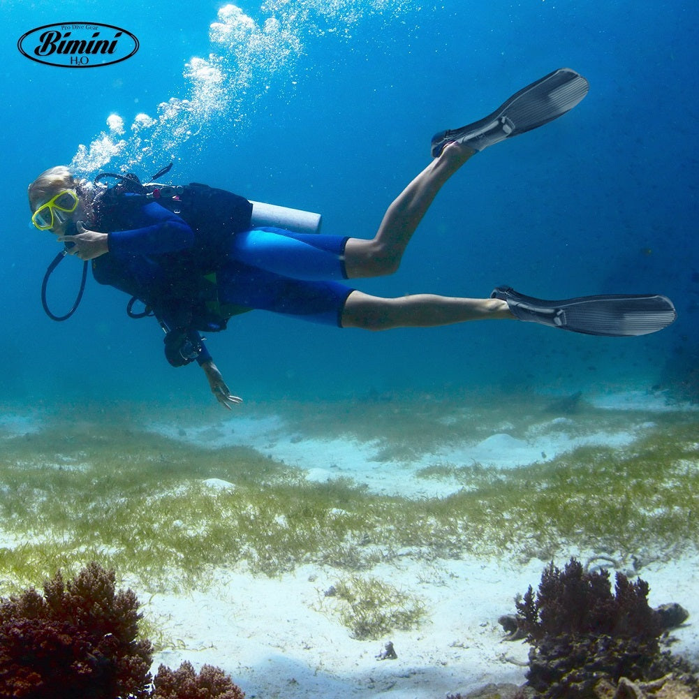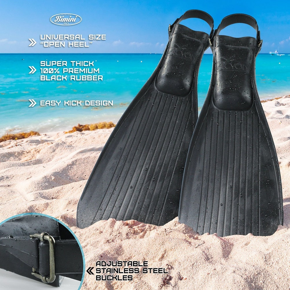 Bimini H2O Alcyon Snorkeling Fins (Fully Adjustable fits 9.5-14) are ideal for any water adventure with the easy kick design, you can swim further with less effort. These fins are a universal size with adjustable straps, this open heel design fits 9.5 to 14 shoe size (EU 43-48). Made from the highest quality natural rubber these wide 35 cm blades...