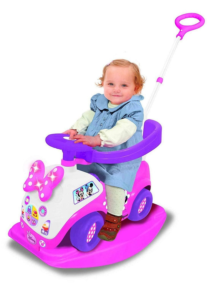 Kiddieland Disney Minnie Lights N' Sounds 4-in-1 Activity Ride-On features an interactive dashboard that makes sounds and plays music as well when your child presses buttons, shifts gears and turns dials. Turn dial for rewarding fun sounds with cute images. Removable rocking base for rocking or riding fun. Transforms from rocker to push-along to ride on. With rigid support around...