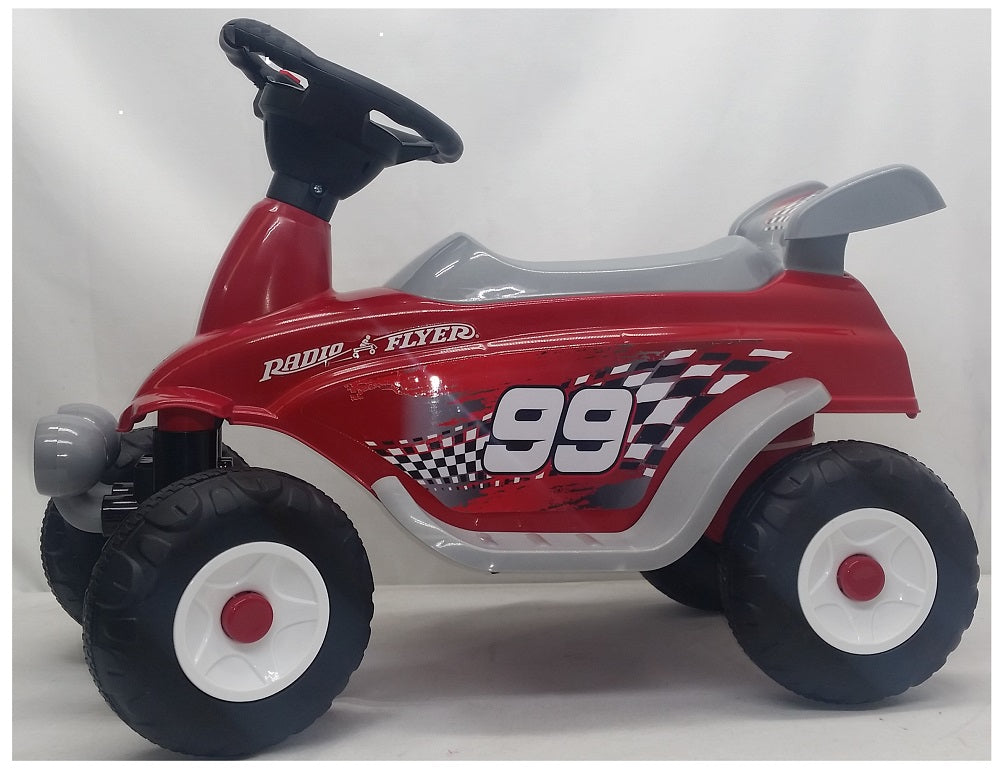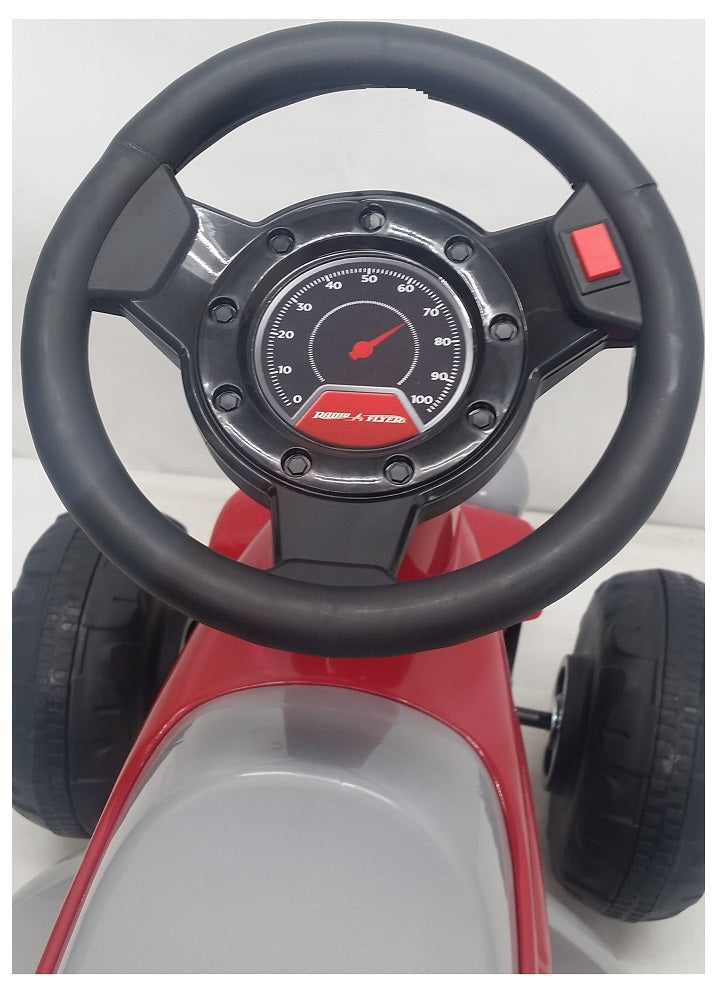 The Radio Flyer Moto Racer 6V Battery Operated Ride-On provides endless fun for imaginative play. An easy push button makes it simple for kids to move forward. The battery-operated ride-on is designed with a wide footrest for comfortable riding and has four 7-1/2" grip tread tires for safe riding. The rechargeable six-volt battery allows with a red button horn. Bring...