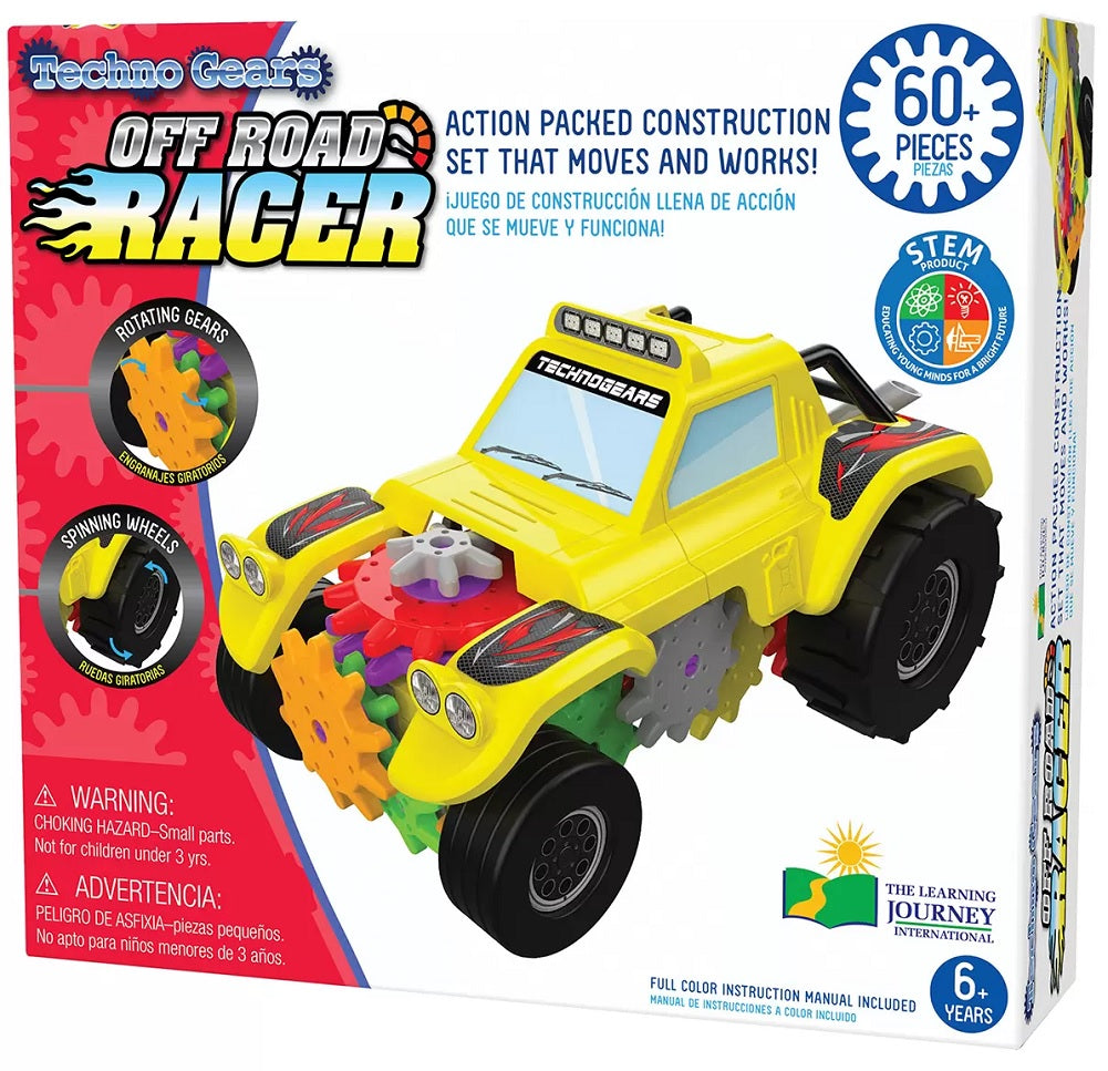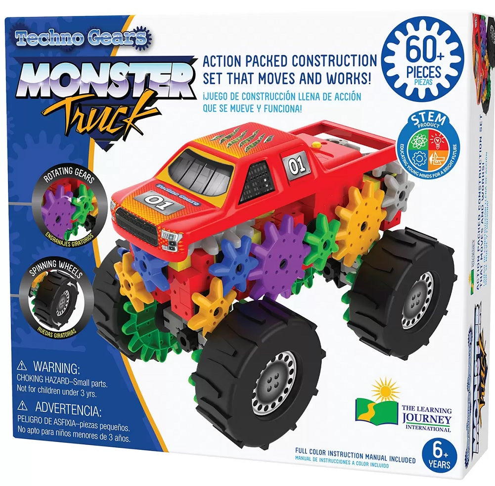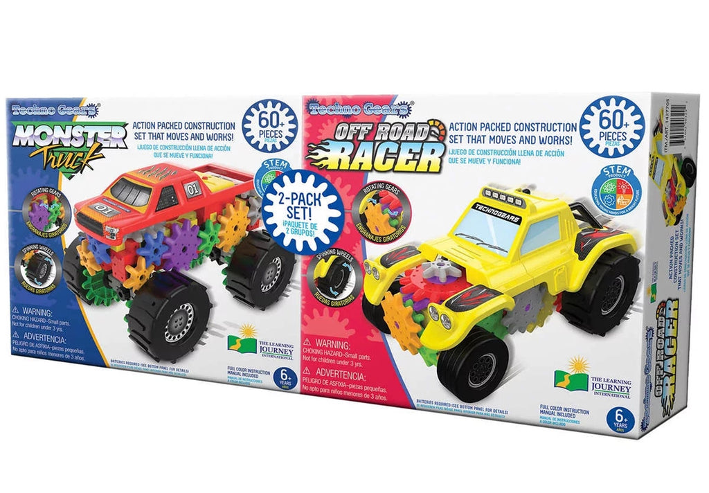 The Techno Gears Monster Truck & Off Road Racer 2 Pack is the ultimate STEM educational toy that encourages free play and imagination. It allows your child to construct the battery operated vehicles using over 60 pieces, with interchangeable parts that allow you to customize each vehicle! Each set has rotating gears and spinning wheels. STEM Product - Educating young...