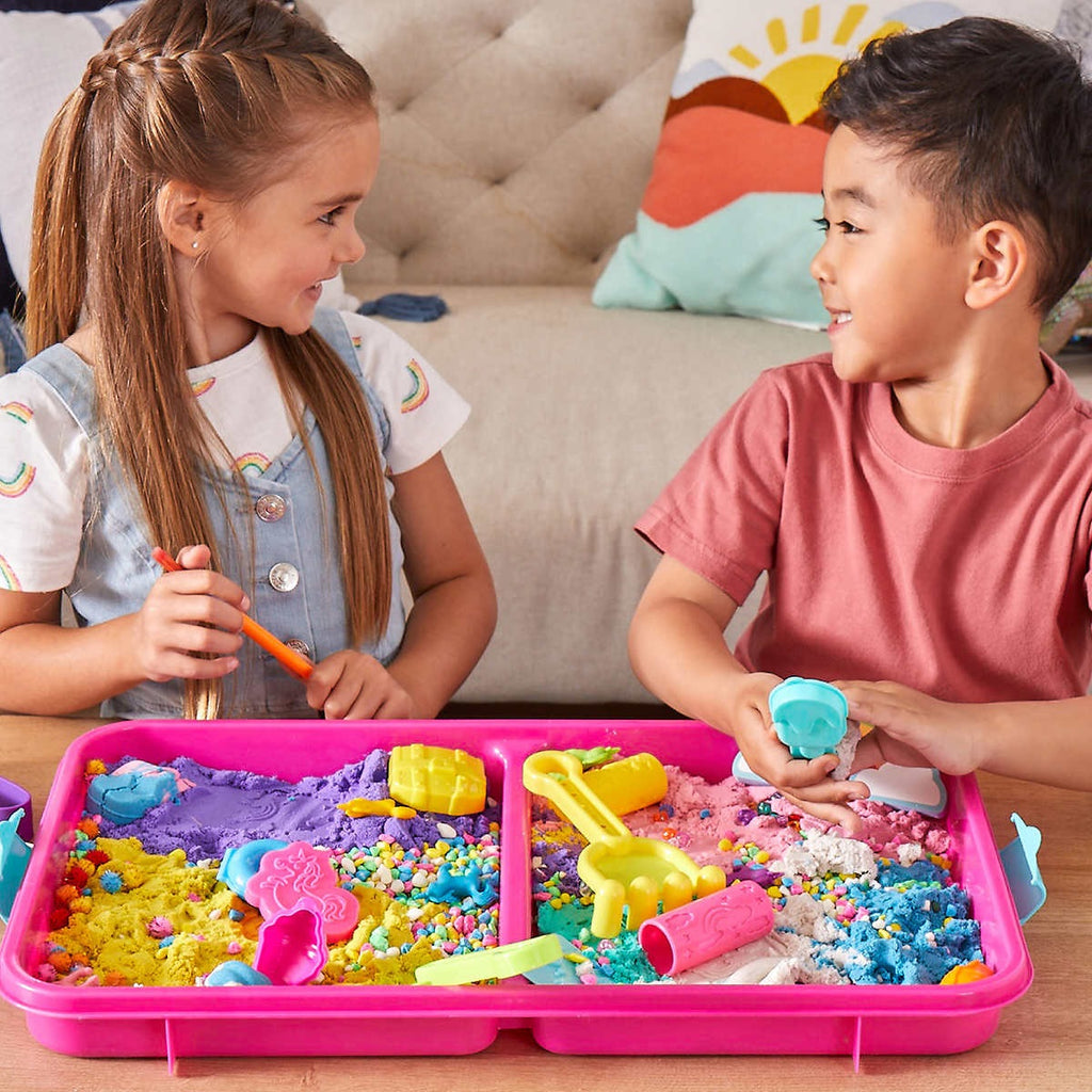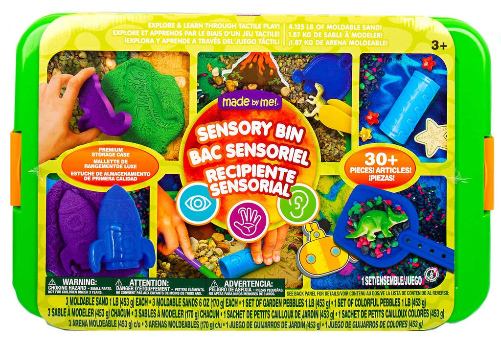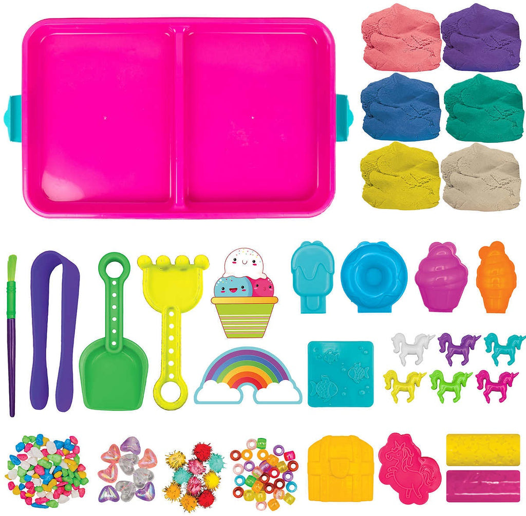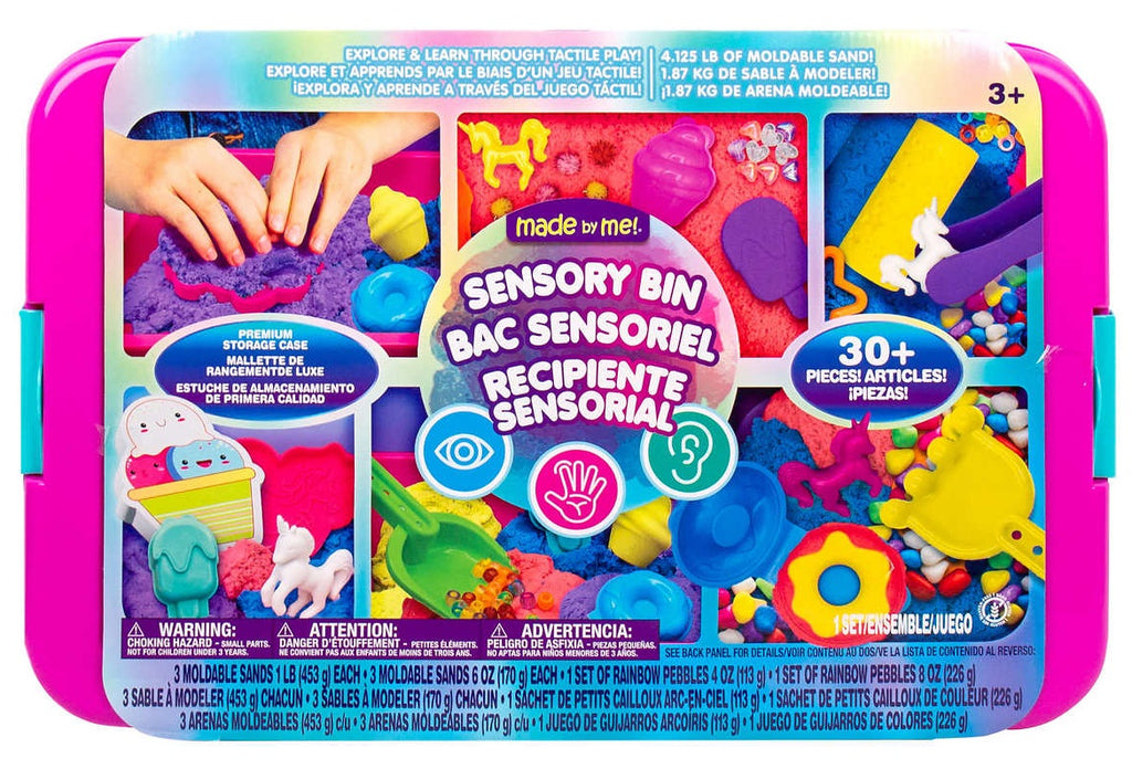 Explore and learn through tactile play with the made by me! 30-Piece Sensory Bin with Moldable Sand Unicorn Ages 3 and Older. The sensory bin includes a premium storage case with lid, rake tool, sand shovel, tongs, 6 unicorn figures, brush, 2 impressions rollers, impression plate, unicorn mold, treasure chest mold, 4 hinge molds, 2 foam shapes, 15 translucent heart...