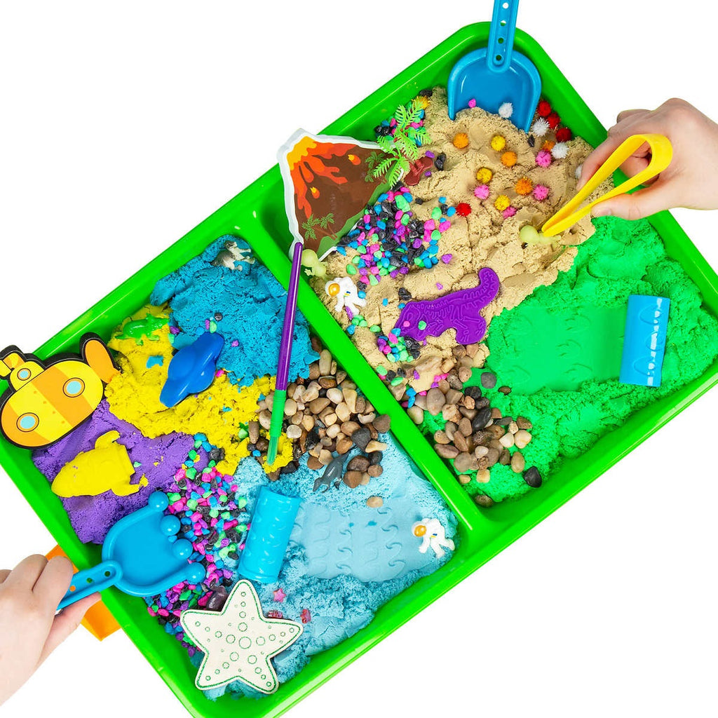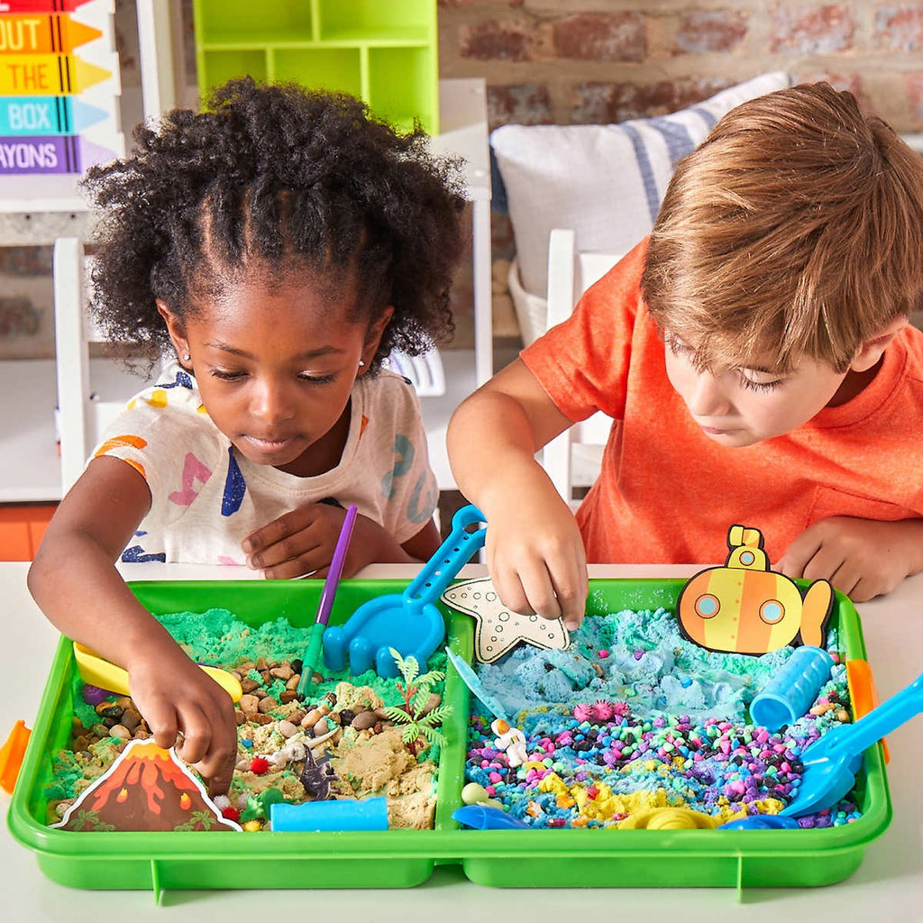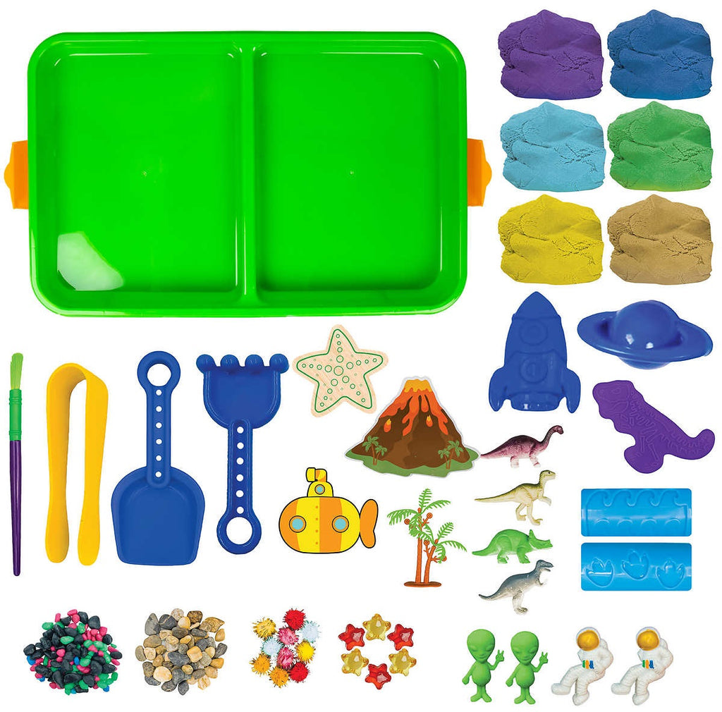 Explore and learn through tactile play with the made by me! 30-Piece Sensory Bin with Moldable Sand Dinosaurs Ages 3 and Older. The sensory bin includes a premium storage case with lid, rake tool, sand shovel, tongs, Wooden starfish shape, 4 dino figurines, 2Alien Figurines, 2 Astronaut Figurines, 1 Plastic Tree, 2 Impression Rollers, 1 Rocket Mold, 1 Planet Mold,...