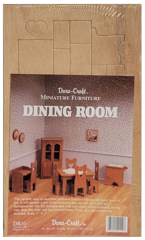New unopened Dura Craft Miniature Wood Furniture #DR10 1988 Dining Room kit. This durable, easy to assemble dollhouse furniture will provide many hours of fun. It will become a part of the memories tat she will carry with her throughout her life. Kit includes table with four chairs, china cupboard, serving cart, desk and chair, and four pictures not included....