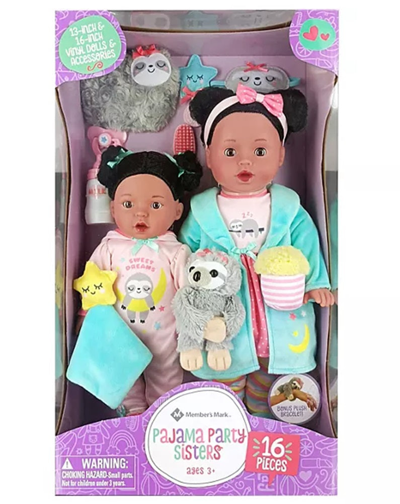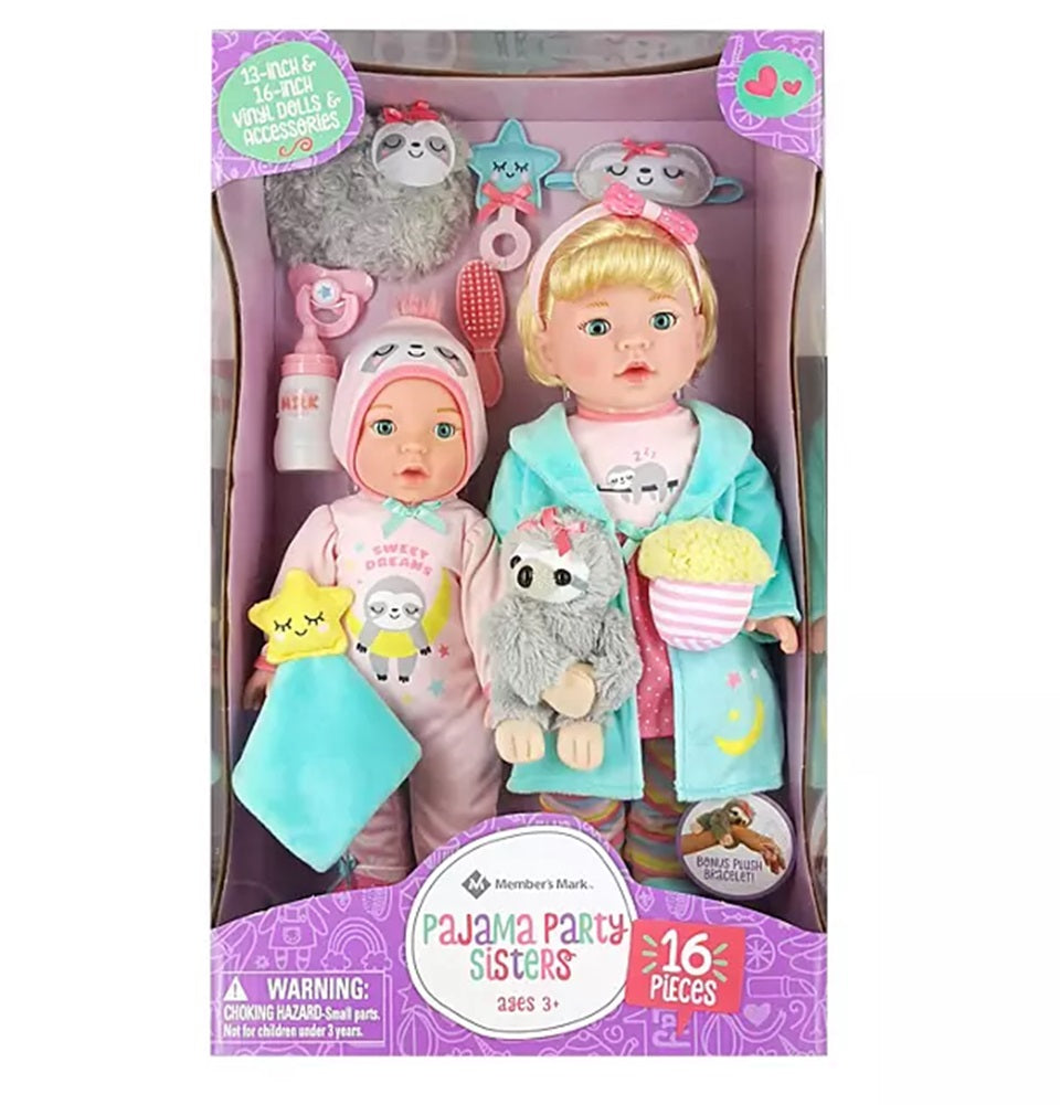 The Member's Mark Sweet Sisters Pajama Party Vinyl Dolls are dressed in cute coordinating outfits with fun and imaginative accessories. With this 16-piece set, your little ones can use their imaginations, play with the accessories, and bring these precious baby girls to life. Children love to take care of dolls, and these sisters will provide hours of enjoyment. These sister...