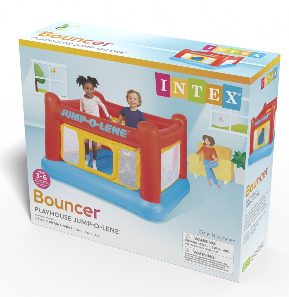 Intex Jungle Adventure Play Center. 8'5"L x 7'1"W x 2'9"H (2.57m x 2.16m x 84cm). 12ga (0.30mm) vinyl. Two pools in one: small pool and larger pool. Includes water slide, inflatable palm trees, flamingo, monkey, ring toss game and 5 balls to fit the wall. Landing mat for extra padding. Includes control valve to adjust the water flow. Small pool...