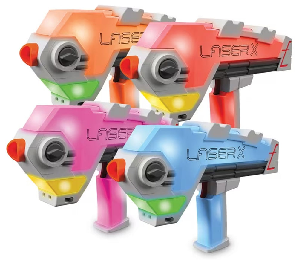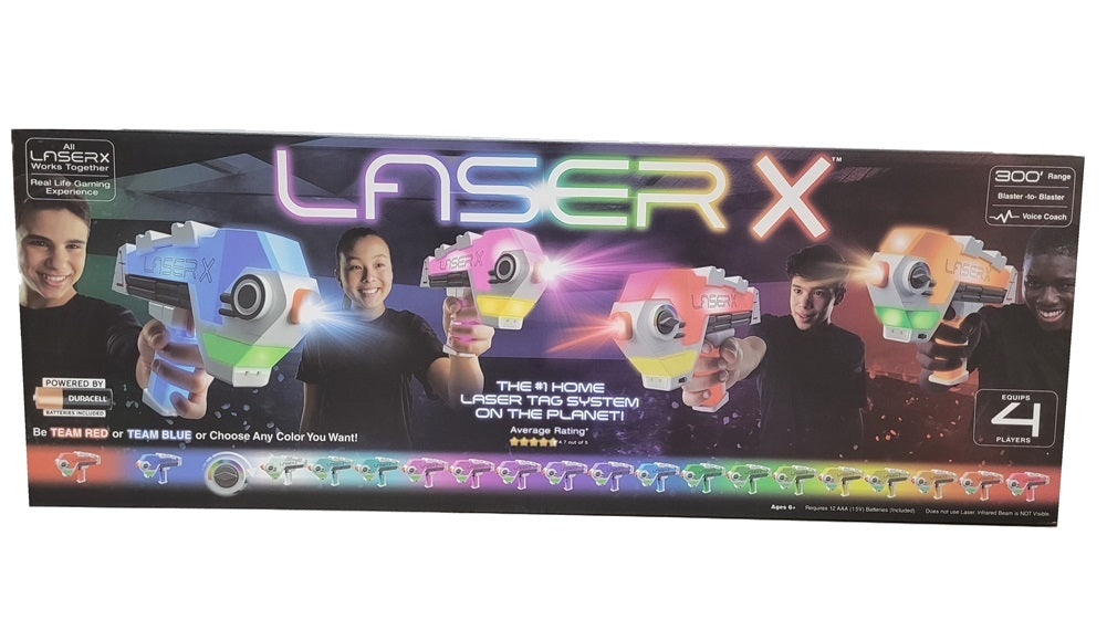 Laser X Blaster-to-Blaster 4-Player Set is bast opponents inside or out, in darkness or bright sunlight. Blaster beams go through windows and strategically bounce off walls and mirrors to hit opponents, while quick-slide reload keeps the action going. Set Includes: 4 Laser X Revolution Blasters and 12 AAA (1.5V) Duracell Batteries. Each blaster has a color lighting effect with up...