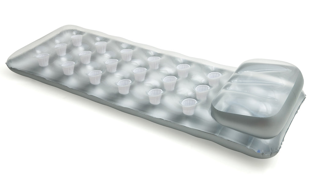 18-POCKET SUNTANNER, Clear Top/Silver Bottom. Soak up the rays while relaxing on the Intex 18-pocket Suntanner Floating Lounge. Featuring a comfortable built-in pillow and durable vinyl construction, the pockets even double as cup-holders. French coil-beam style air mattress is supportive and comfortable. This floating lounge is the right choice for a warm day out on the water! Buy in bulk...