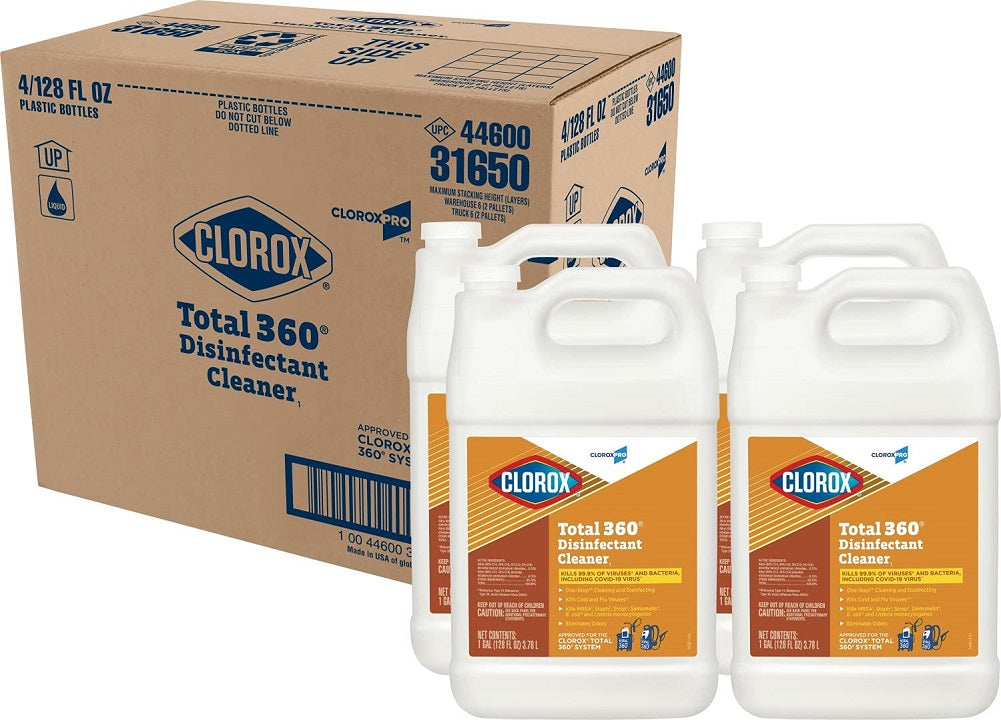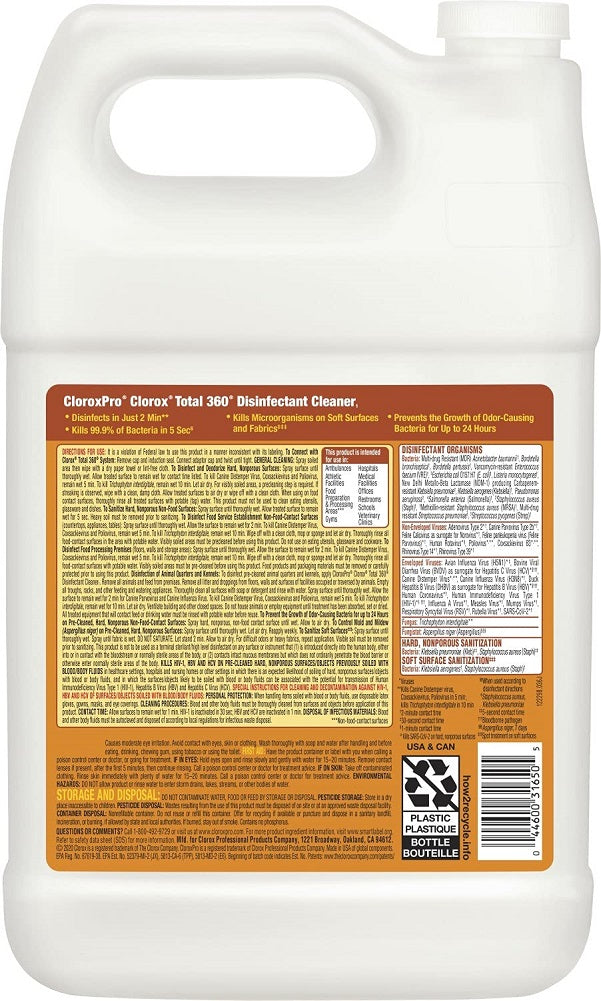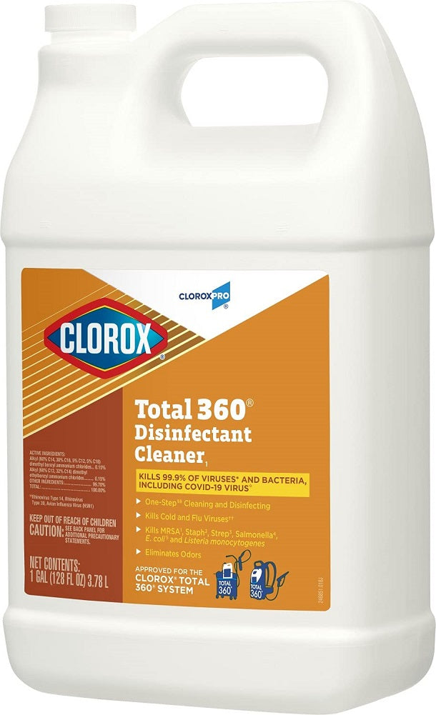 CloroxPro Total 360 Disinfectant Cleaner is designed to be paired with the Clorox Total 360 Electrostatic Sprayer to clean, disinfect and deodorize. This disinfectant cleaner kills 99.9% of bacteria in 5 seconds and is EPA registered to kill 44 organisms including cold and flu viruses (Rhinovirus, Influenza A), Methicillin-resistant Staphylococcus aureus (MRSA), Norovirus, Salmonella enterica, Pseudomonas aeruginosa, Staphylococcus aureus (Staph)...