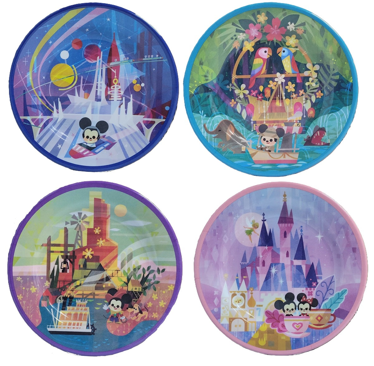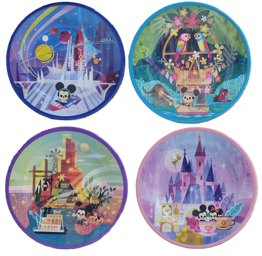 Mickey and his friends are pictured enjoying a fun time at the Disney Parks on this set of colorful plates designed by artist Joey Chou. Each of the four melamine plates has different artwork representing a specific land with its attractions, so they're perfect when you're hungering for your next visit to the Parks. Features: Set includes four melamine plates....