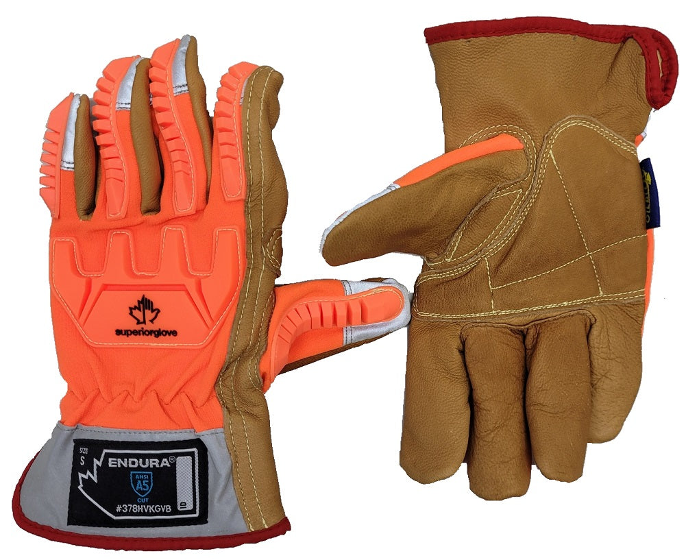 The Superior Glove Endura Oilbloc HI-VIZ CUT-RESISTANT Anti-Impact Driver Glove with Olibloc, Small, is an impact-resistant with back-of-hand protection safeguards against knocks and bumps without impeding flexibility or dexterity. Treated with Oilbloc for unbeatable oil and water resistance. ANSI cut-level A5 protection. ANSI Puncture ANSI 4. Blended Graingoat palm blended for vibration dampening.