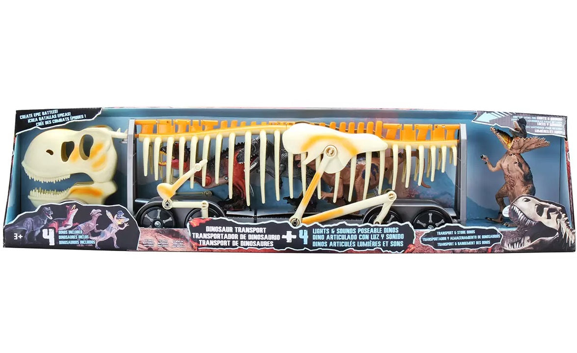 Let your imagination run wild with this 5 pack of highly detailed Poseable 9 inch Dinosaurs. With your collection you can create your own epic Dinosaur battle as you play out your own story with friends! Squeeze the dinosaurs jaw for lights & sounds. Each figure is approximately 9 inches. The skeleton of a dinosaur becomes a transportation and storage...