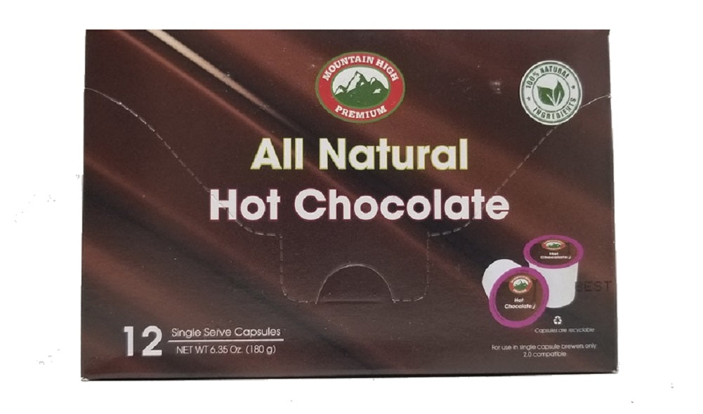 The Mountain High Premium All Natural Hot Chocolate K Cups Compatible 60-Count is a velvety and smooth all Natural Hot Chocolate that delivers a rich and full flavored cup. Our all Natural Hot Chocolate is made with premium cocoa for a delicious cup of Hot Chocolate the whole family can enjoy! Ingredients: Sugar, Non-Fat Milk, Cocoa (Processed w/ Alkali), Salt...