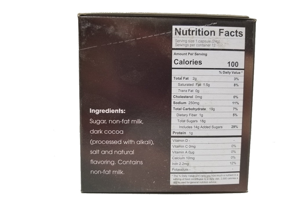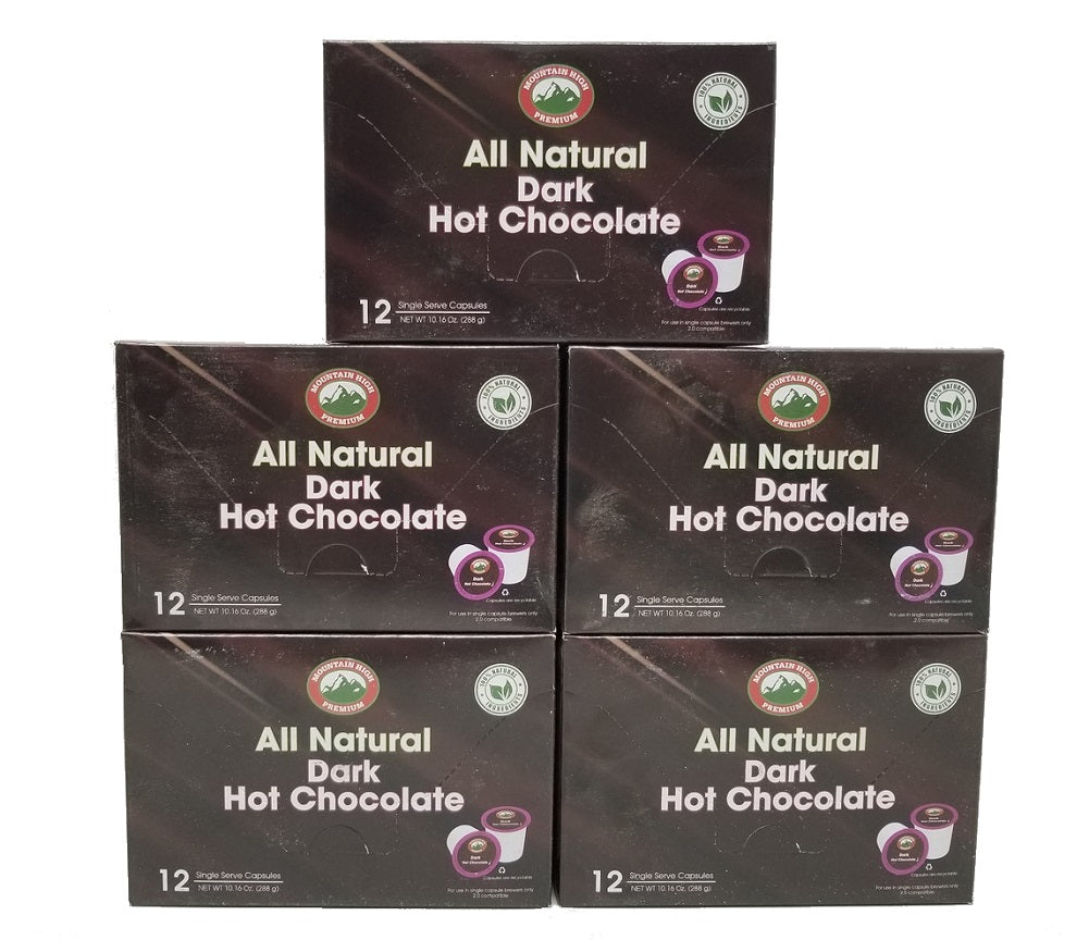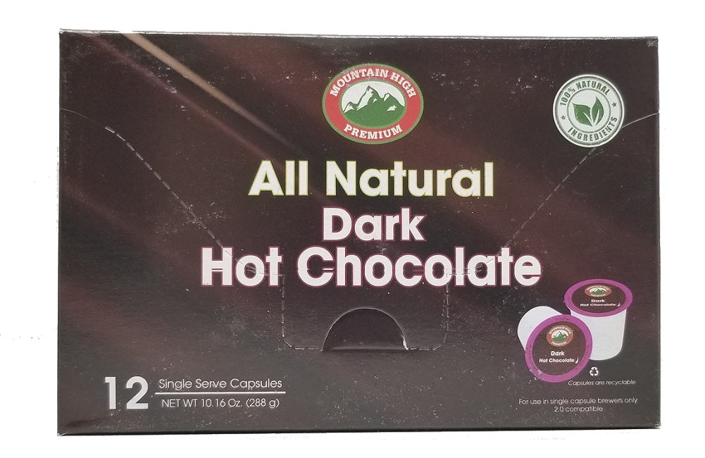 The Mountain High Premium All Natural Dark Hot Chocolate K Cups Compatible 60-Count is a velvety and smooth all Natural Hot Chocolate that delivers a rich and full flavored cup. Our all Natural Dark Hot Chocolate is made with premium cocoa for a delicious cup of Hot Chocolate the whole family can enjoy! Ingredients: Sugar, Non-Fat Milk, Dark Cocoa (Processed...