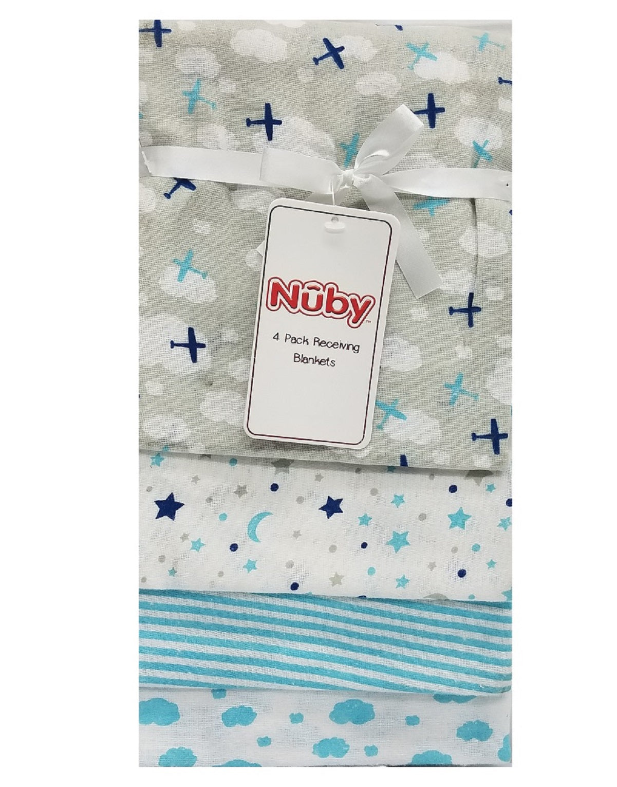The Nuby 4-Pack Receiving Blankets Gift Set, Airplane Theme, are super soft and cute as can be. The four pack is 100% cotton, super durable and comfortable. Nuby's Cuddly Soft Blue Plane 4-Pack Cotton Receiving Blankets will keep your little one warm and stylish. Also a great gift idea for a friend or family member expecting!! Perfect size for swaddling...