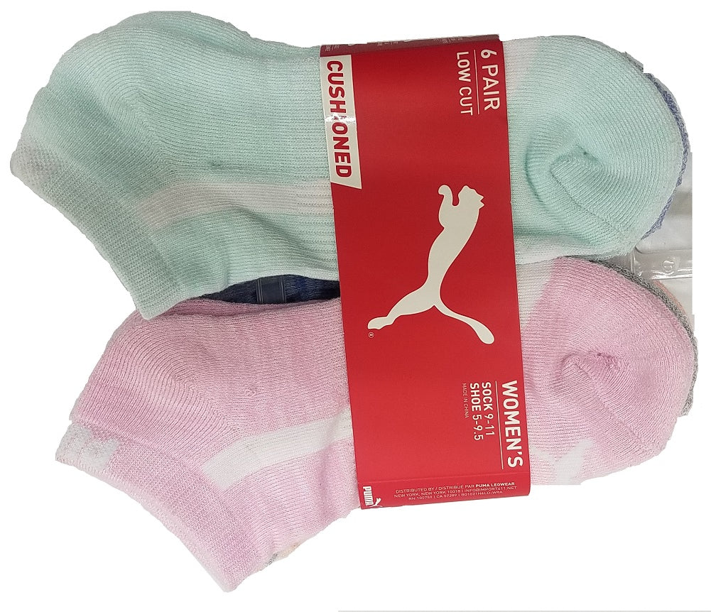 The Puma 6-Pair Low Cut Multi-color Cushioned Women's Sock Size 9-11 (Shoe Size 5-9.5) is perfect complement to your active lifestyle, these low-cut athletic socks come in a variety of colors and are crafted with moisture-control mesh ventilation, cushioned sole and extra arch support. Details: 6-Pack. Socks Size: 9-11. Shoe Size: 5-9.5. Polyester: 98% Spandex 2%. Colors: blue, purple, teal,...
