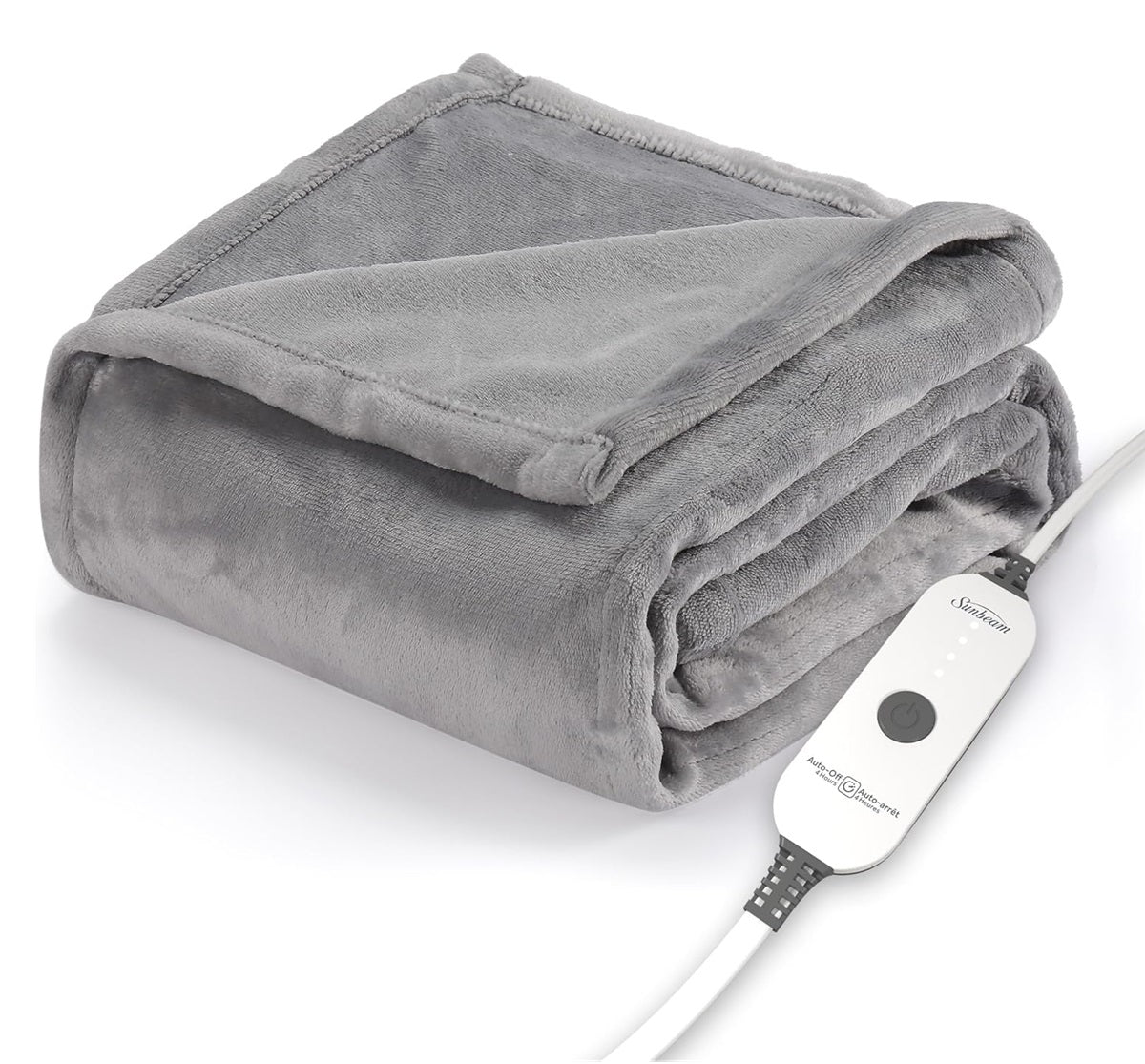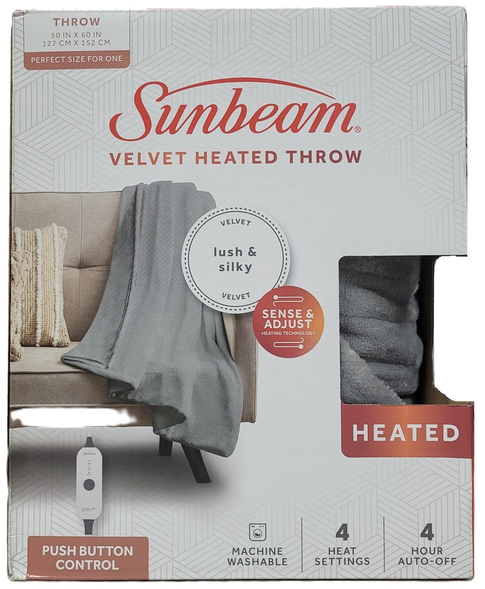 Get warm and comfortable with the Sunbeam 11721 Velvet Electric Blanket Throw 4 Settings Gray 50 X 60. Rest easy knowing the heart of your throw, the heated wire, is made with premium components. It provides fast, even warmth and has features to help prevent overheating. Advanced safety circuits help to monitor the throw's operations during use. Heated wire technology...