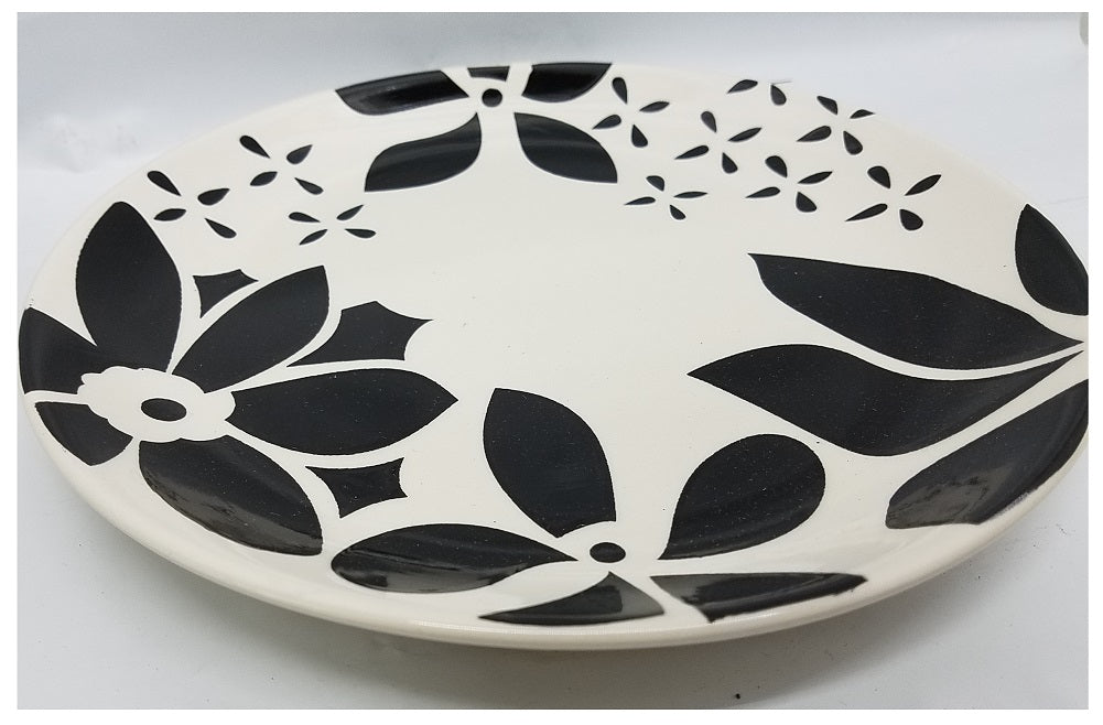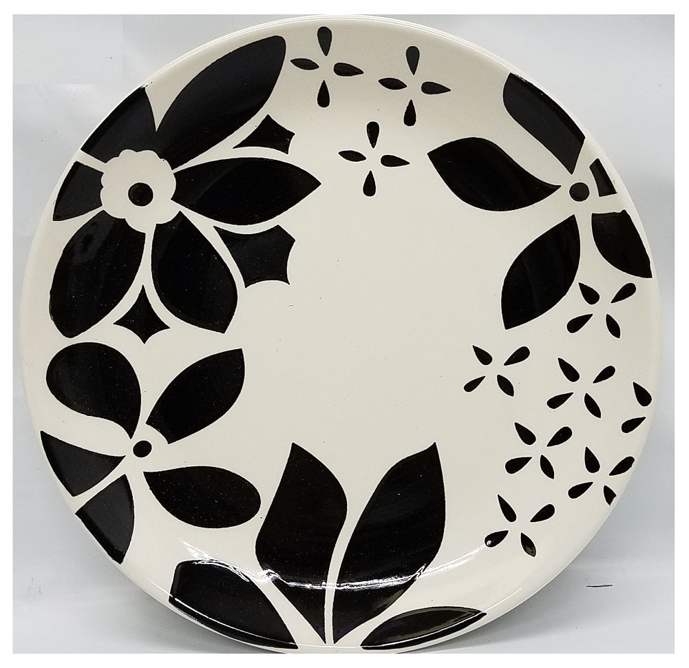 Tabletops Unlimited Alyson White with Black Ceramic 13" Shallow Pasta Bowl features a smooth edge with a brilliant crafty geometric floral design. Tabletops Unlimited inspired White & Black Geometric Floral Design Shallow Pasta Bowl. Approx. dimensions: 13" D x 2.5" H. Dishwasher and microwave safe.