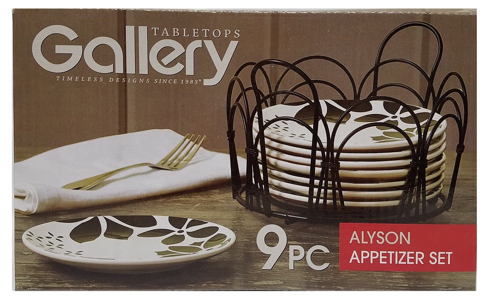 The Tabletops Gallery ALYSON 9-Piece App Plate Set includes eight 6-inch appetizer plates and a 6 x 5 1/4 inch rack. The Alyson design is a white ceramic plate with black scrolling lines and crafty geometric floral design. The plates are 6-inch round. The plates are dishwasher and microwave safe.