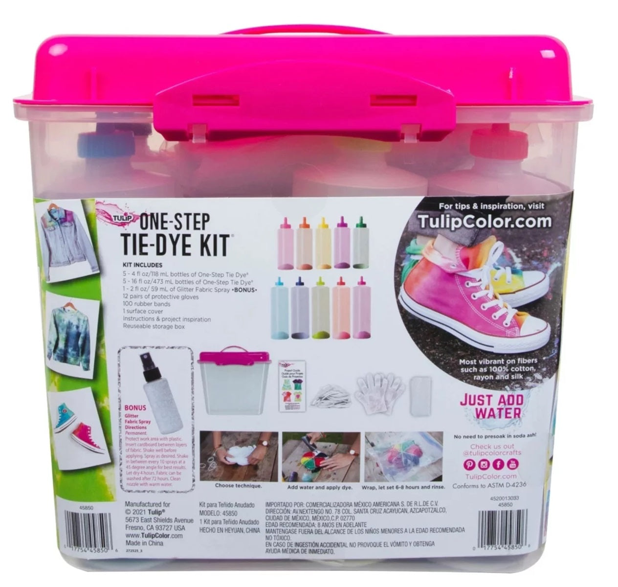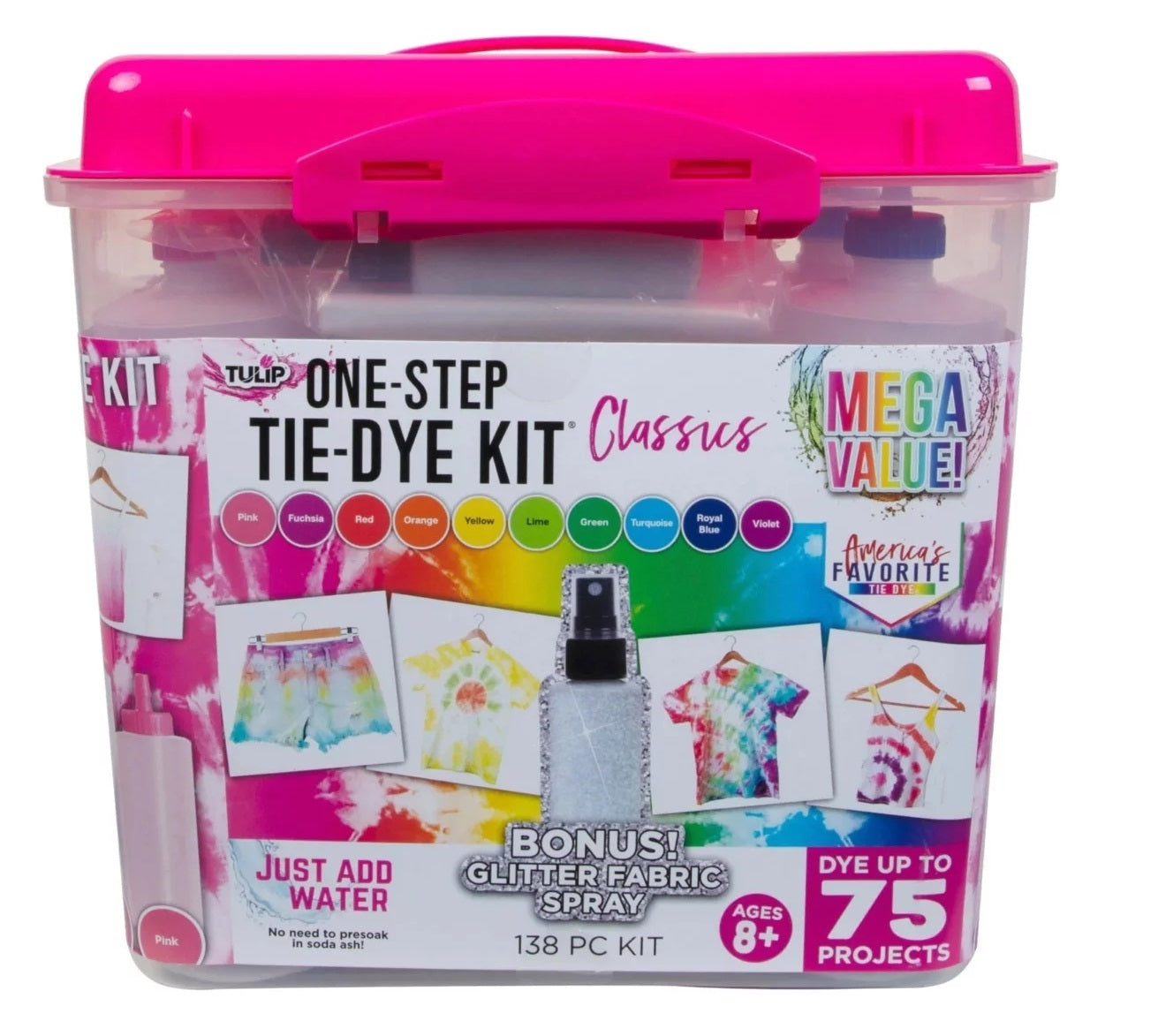 Tulip One-Step Tie-Dye Kit: 10-Color Value Tub with Bonus Glitter Fabric Spray Get the ultimate tie-dye experience within the Tulip Mega Tie Dye Tub with glitter spray! Stocked with 100 ounces of One-Step Dye in a must-have rainbow palette: 5 (16-oz.) extra-large dye bottles (fuchsia, red, lime, royal blue, and turquoise), and 5 (2.75-oz.) dye bottles (pink, orange, yellow, green,...