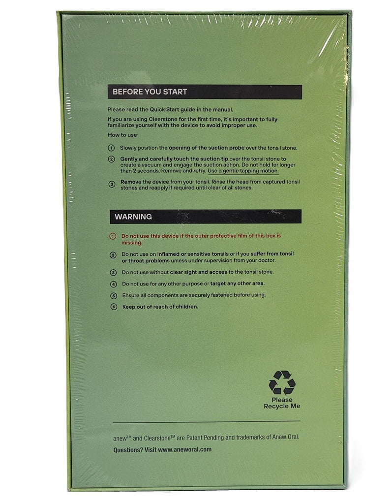 Clear tonsil stone effectively for a total cleanse with the anew Clearstone Electronic Vacuum Tonsil Stone Remover with LED Guidance Light. asily extracts visible tonsil stones for a clear, complete cleanse. Safety comes first with our supremely soft food-grade silicone probes, providing a comfortable and safe contact point. Bright and perfectly directed light illuminates the target area for full visibility....