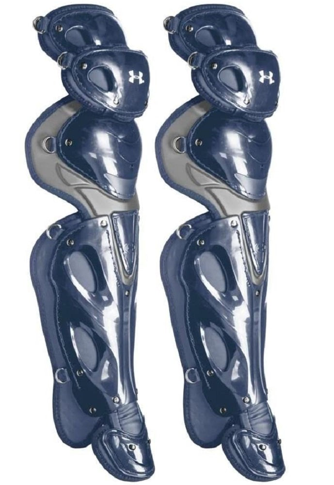 Under Armour Converge Youth Pro Catcher's Leg Guards 14.5" Navy features a plastic shell. Molded knee with Charged Foam. Comfortable and soft when resting on knees, stiffer impact protection when dropping to block. Enhanced patella tendon protection. Re-positioned gel knee pads. Pre-crossed harness. Ages 9 to 12 years