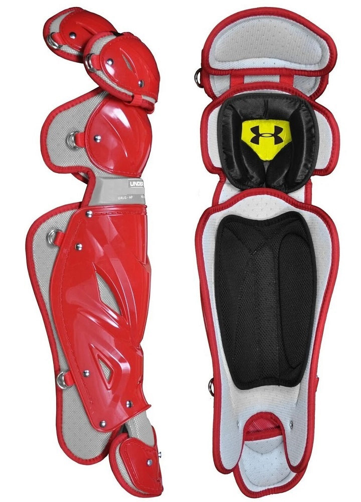 Under Armour Intermediate Pro Catcher's Leg Guards Ages 12 to 16 Scarlet Red, features a triple knee design. High impact PE plastic components. Large vent holes in shin and knees. Perforated foam for breathability. Gel knee pads, extra neoprene straps. Removable second toe. AEGIS Microbe Shields. Length 14.5 inches