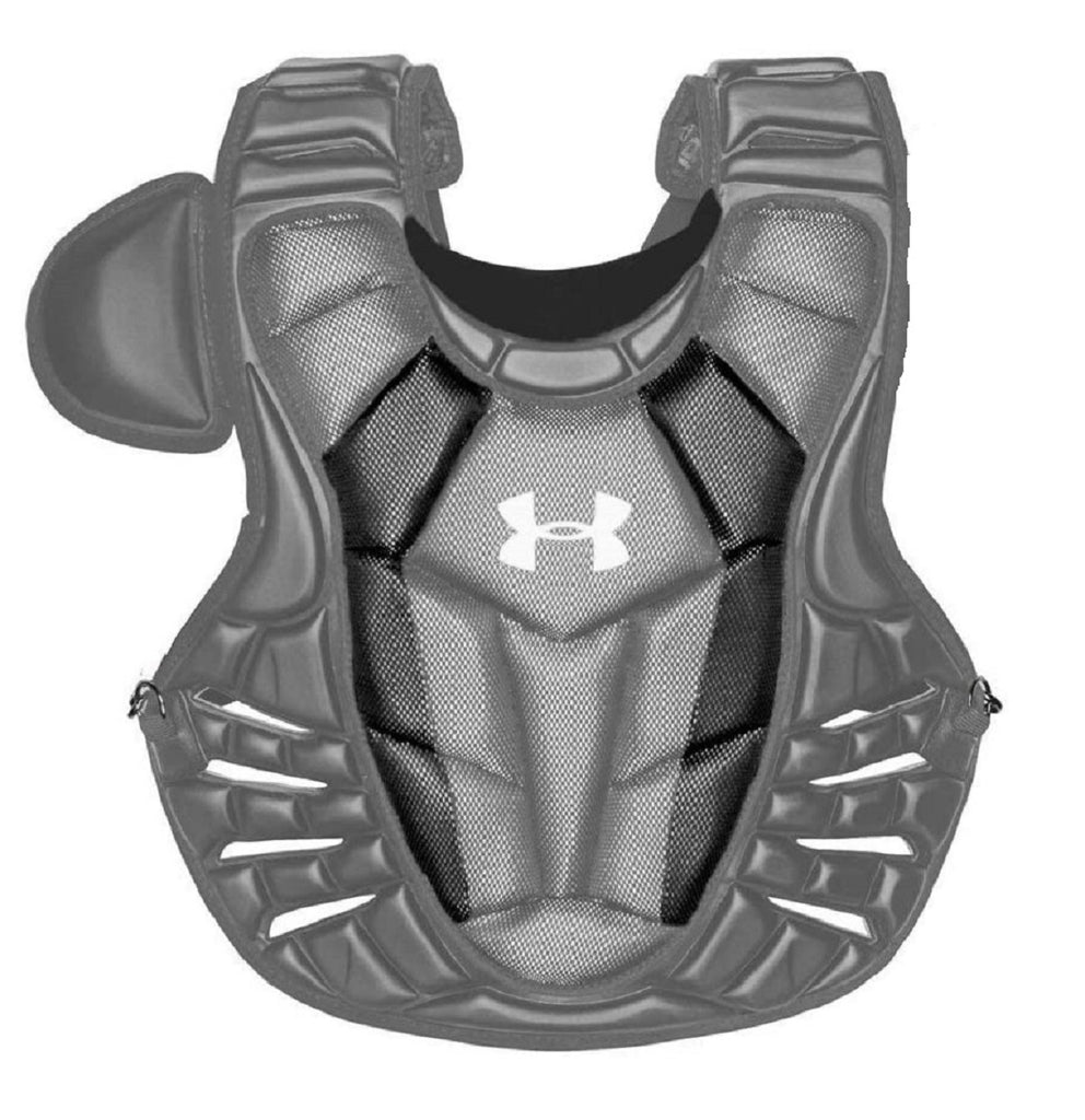 Under Armour Youth Chest Protector 14.5" Black Junior Ages 9-12 features a fully adjustable shoulder cap, plastic inserts in throat, shoulders, and abs disperse impact. Low rebound foam deadens ball. Heat Gear wicks away moisture. Customizable straps and harness keep chest protector secured in place. Ventilation ports on back. Aegis Microbe Shield kills unwanted bacteria from forming. Length: 14.5 inch....