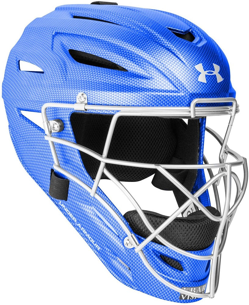 The all new Under Armour Youth Carbon Tech Baseball/Softball Catcher's Helmet Royal (Age 7-12) features a matte finish, high impact resistant ABS plastic shell designed to deflect and absorb impacts. The I-Bar Vision steel cage increases player's sight lines by using flattened bars which also increase the strength of the cage. Includes soft, breathable, moisture wicking, and machine washable liner...