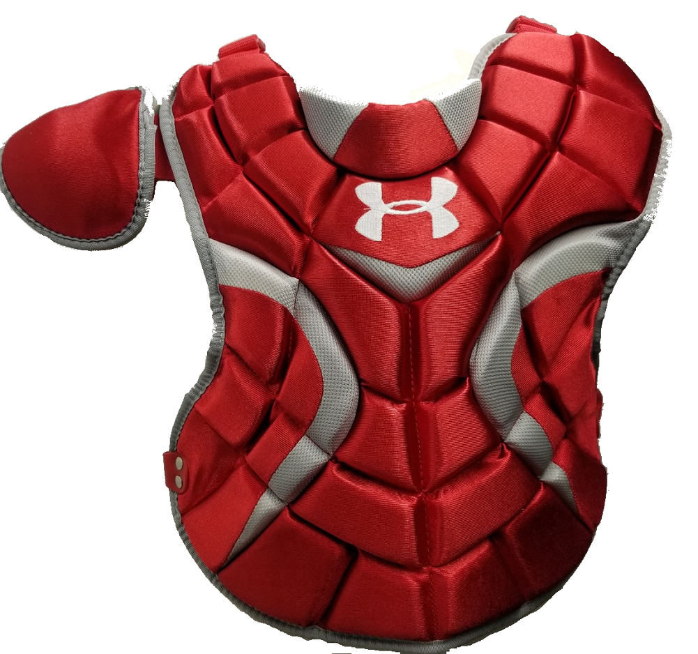 Under Armour Youth Chest Protector 14.5" Scarlet Junior Ages 9-12 features a fully adjustable shoulder cap, plastic inserts in throat, shoulders, and abs disperse impact. Low rebound foam deadens ball. Heat Gear wicks away moisture. Customizable straps and harness keep chest protector secured in place. Ventilation ports on back. Aegis Microbe Shield kills unwanted bacteria from forming. Length: 14.5 inch....