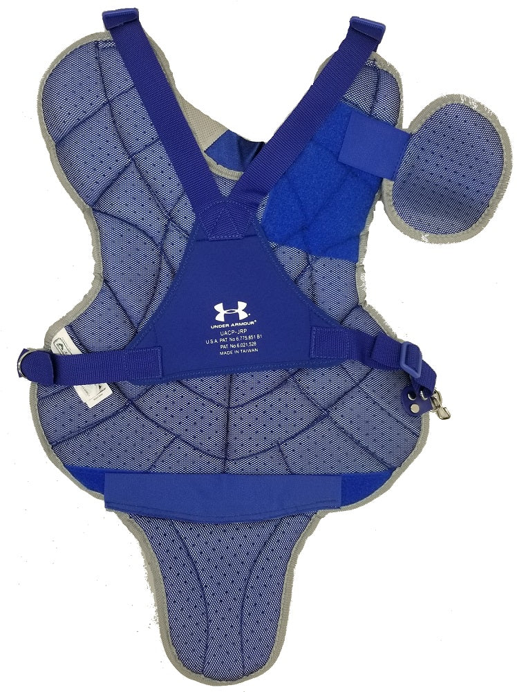 Under Armour Youth Chest Protector 14.5" Royal Blue Ages 9-12 features a fully adjustable shoulder cap, plastic inserts in throat, shoulders, and abs disperse impact. Low rebound foam deadens ball. Heat Gear wicks away moisture. Customizable straps and harness keep chest protector secured in place. Ventilation ports on back. Aegis Microbe Shield kills unwanted bacteria from forming. Length: 14.5 inch....
